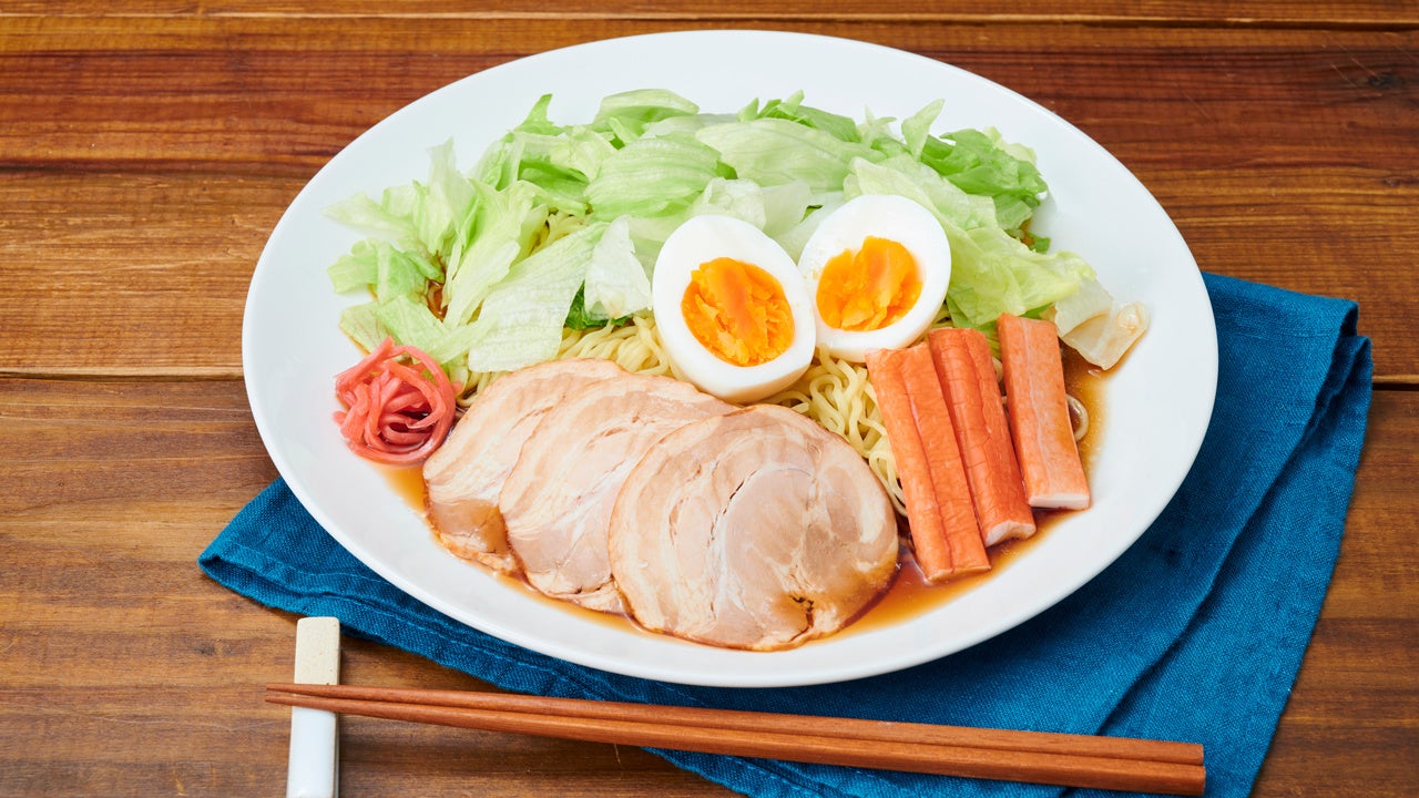 まずは、レタス、チャーシュー、ゆでたまご、カニ風味カマボコを使った、 食卓がパッと明るくなる色鮮やかな冷やし中華。レタスのシャキシャキ食感が心地よく、ツルツルの麺によく合います。