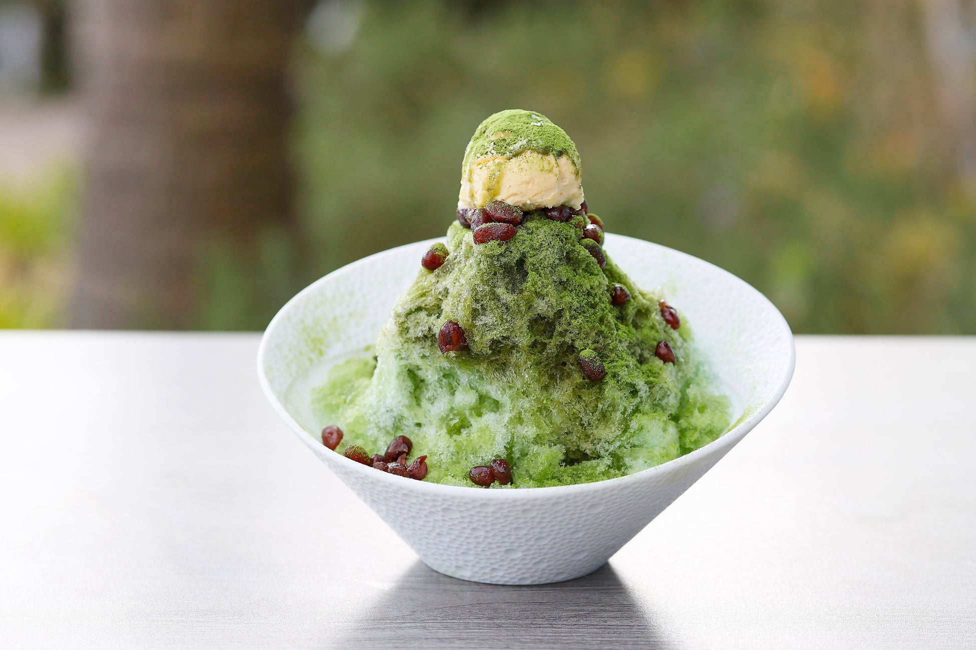 抹茶は爽やかな抹茶ソースと濃厚な抹茶ソースの2種類のソースを使用することで、味に変化を加えた飽きの来ないかき氷。アクセントに大納言を飾り、抹茶のかき氷と共に風味豊かで上品な甘さの小豆をお楽しみいただけます。仕上げにバニラアイスをトッピングし、夏にぴったりのひんやりスイーツ に仕上げました。