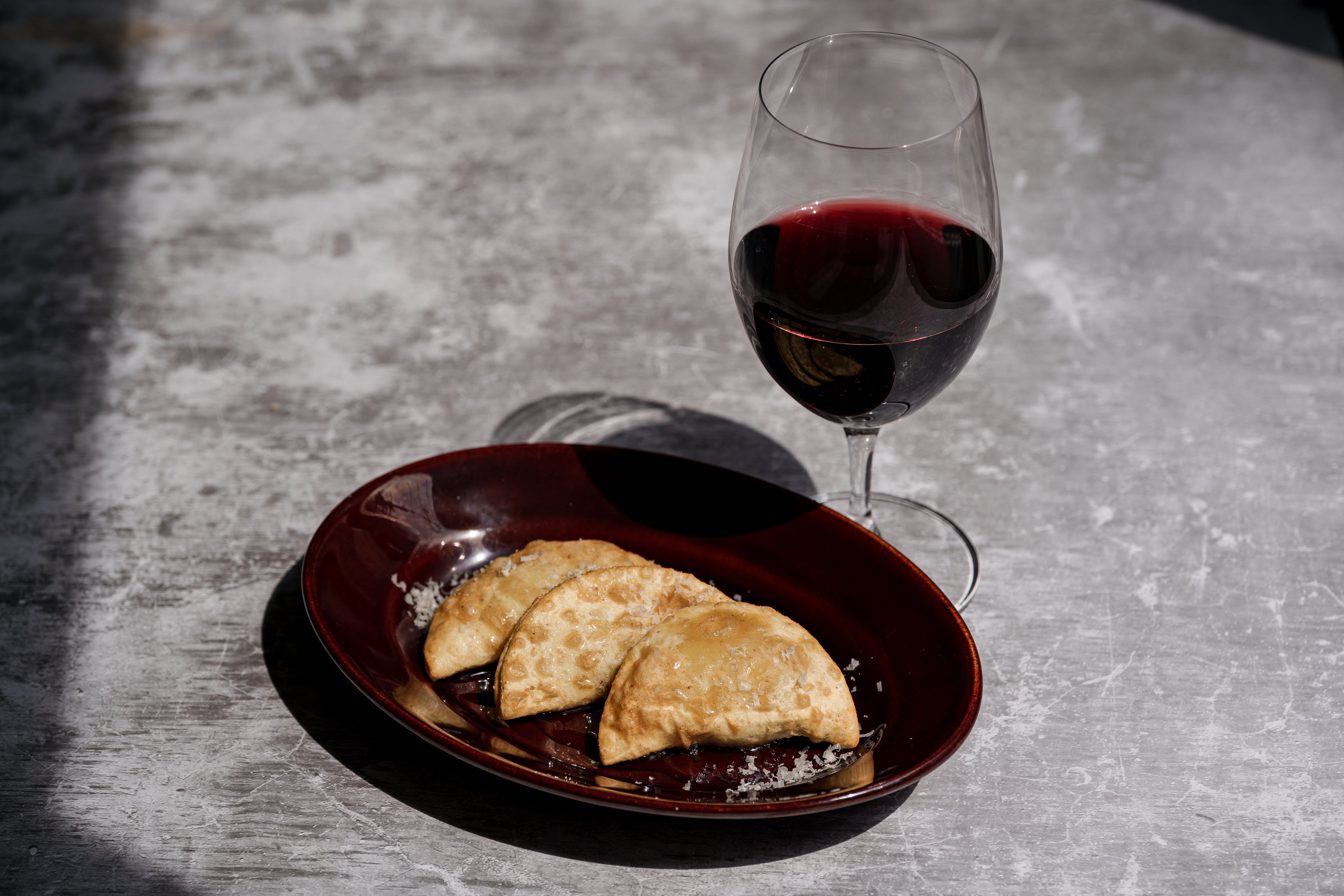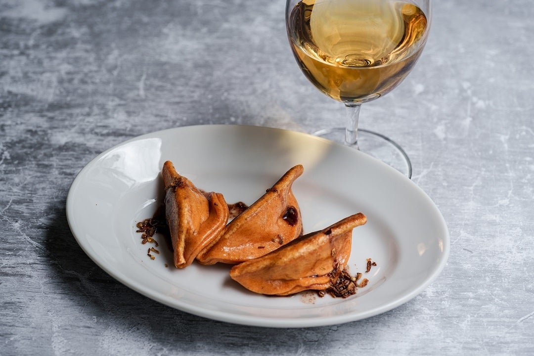 羊のミンチ肉に、焙煎したクミンやコリアンダーなどのスパイスを合わせました。中身のタネだけでなく生地にもスパイスを練りこんだダブルスパイス製法。ソースには赤ワイン風味のバルサミコソースで上品に仕上げています。