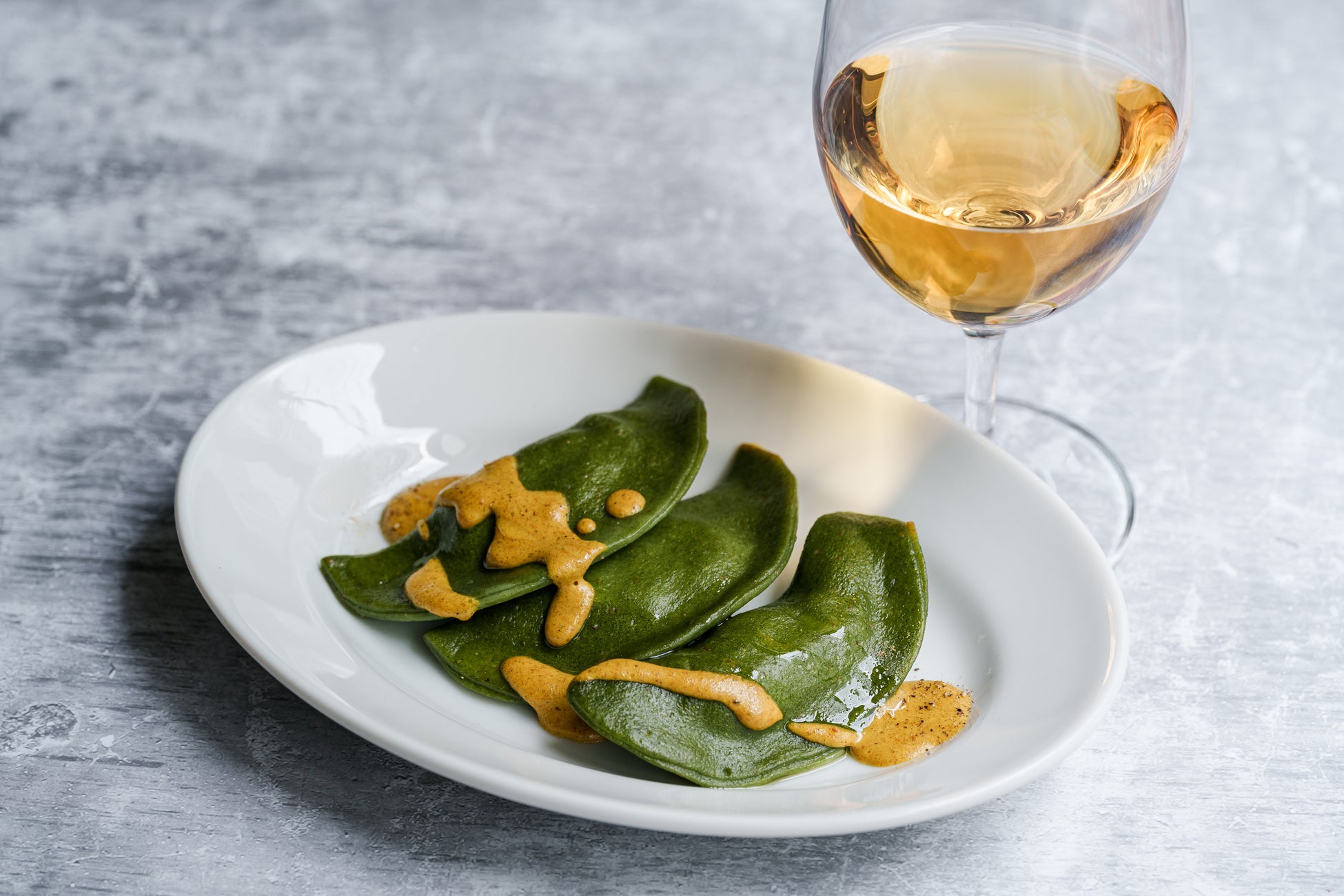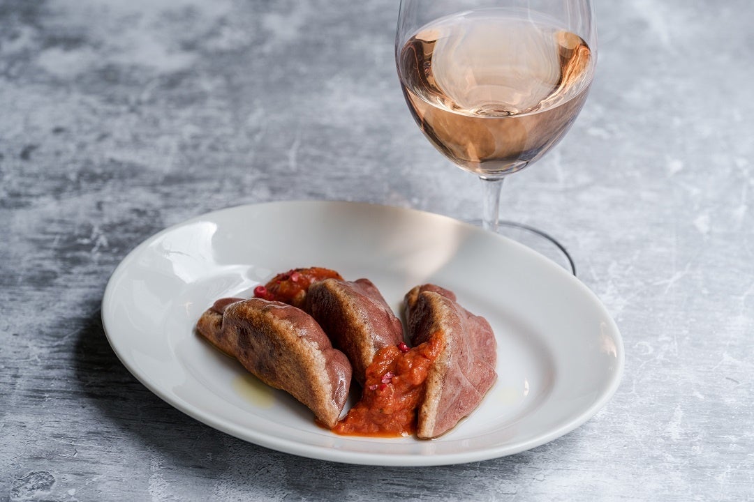 じっくり煮込んだ鴨肉と苦味のあるクレソン、ホウレン草の生地で包めば不思議と餃子のようで餃子でもないラビオリ風に。アクセントにサフランの香りあるソースは、白ワインにも赤ワインにも相性抜群です。