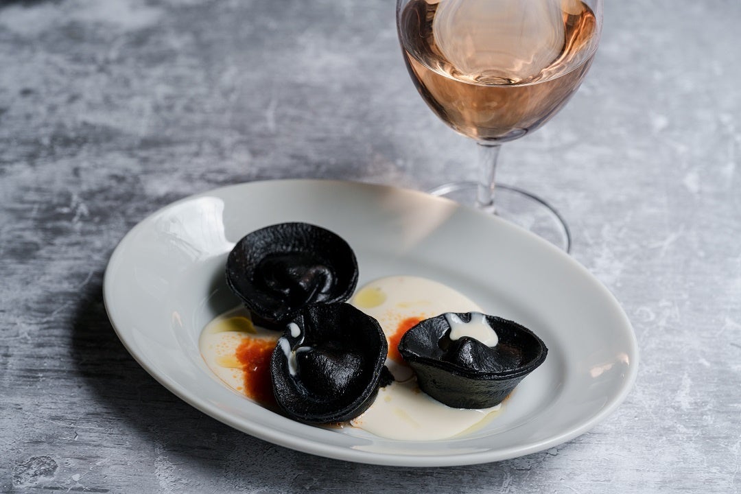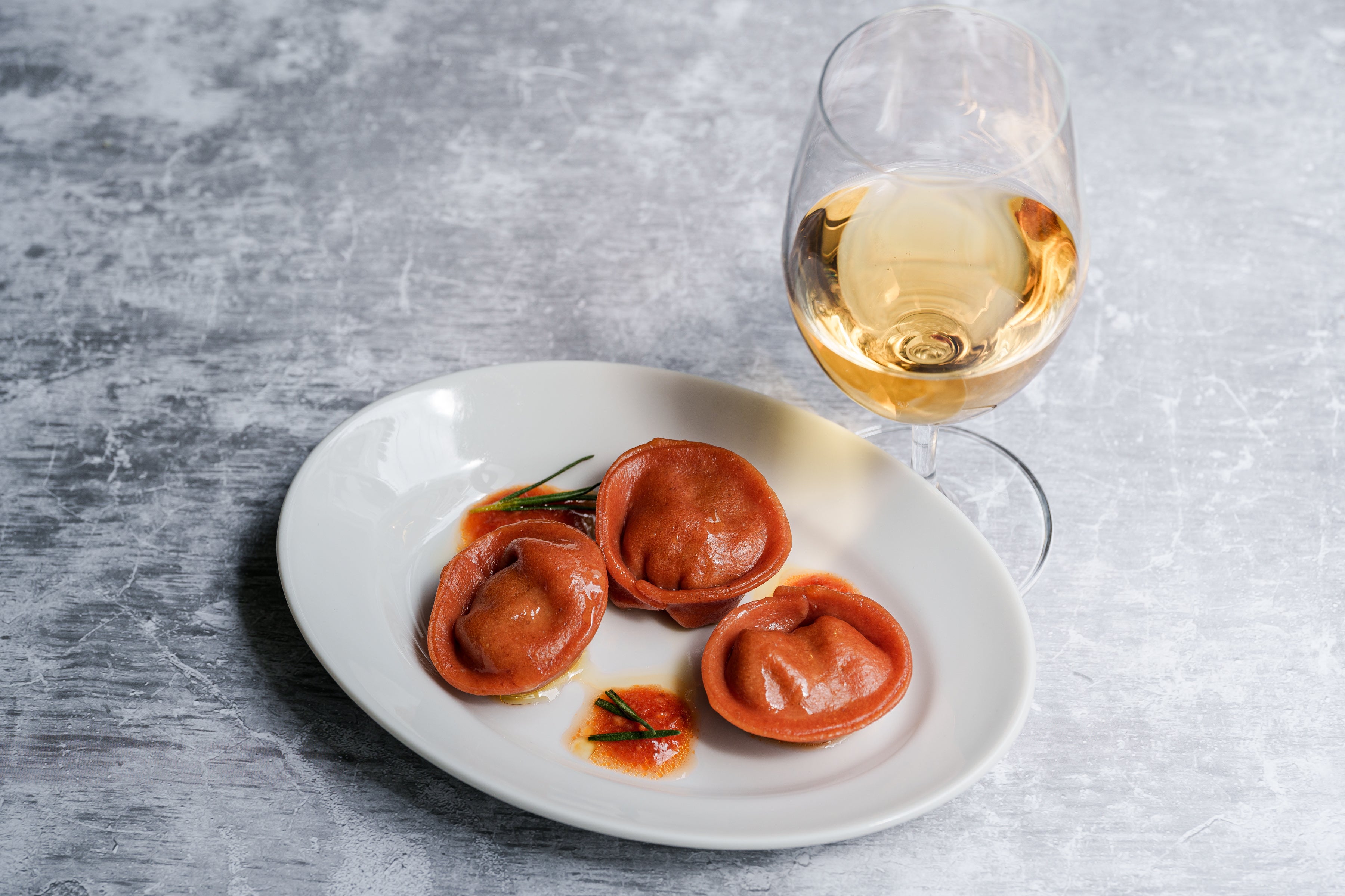 魚介の旨味たっぷりタコとオリーブの煮込みを、ビーツを練り込んだ生地。今の季節にぴったりのピンク色のラビーザ。コク深い海老のソースと一緒にお召し上がりください。