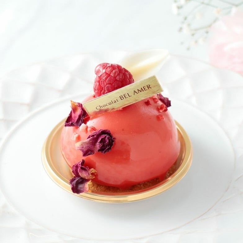 「花とフルーツのマリアージュ」をテーマにした母の日限定のプチガトー。ルビーチョコのムースの中に、ほのかにローズの香りをつけたホワイトチョコのガナッシュとカシスのジュレを閉じ込めました。