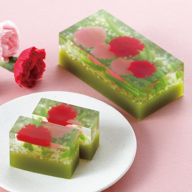 涼やかな錦玉羹に浮かぶ鮮やかな赤とピンクのカーネーション。下になめらかな羊羹を重ねた二層の棹菓子。