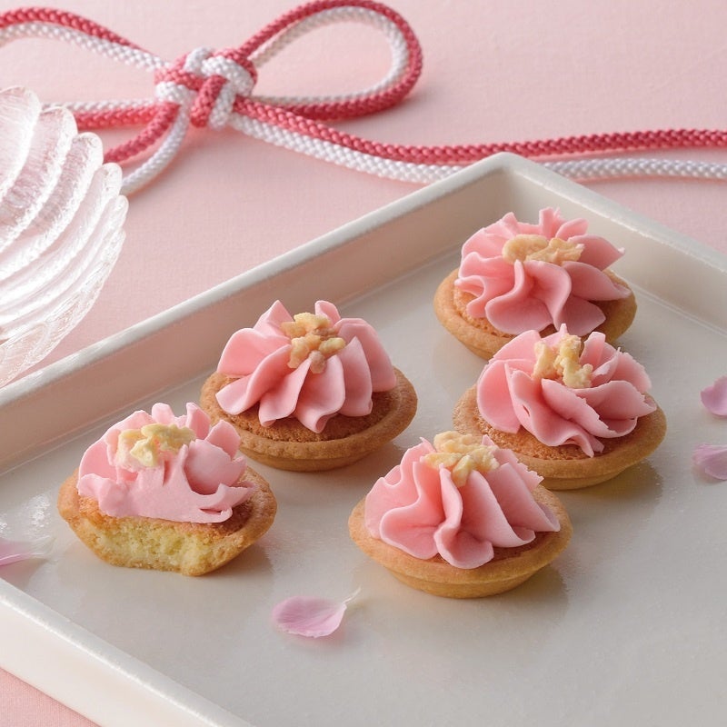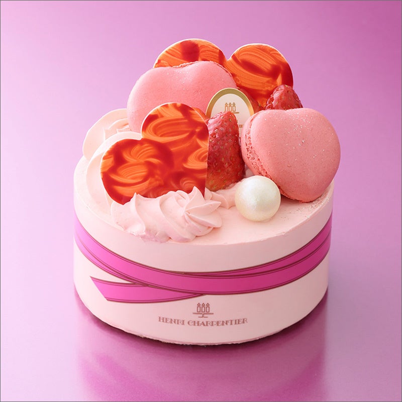 しっとりしたジェノワーズに、いちご風味のクリーム、甘酸っぱくジューシーないちごのジュレをサンド。いくつものハートを飾って。 販売:5/6(金)~8(日)