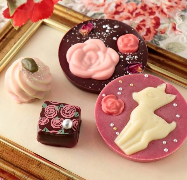「ローズノワール」と「ルビーフレ-ズ」の限定フレーバー。苺やフランボワーズ、ローズオイルなど華やかな香りや味わいの素材を使用したショコラにバラやバンビのモチーフで華やかに仕上げました。