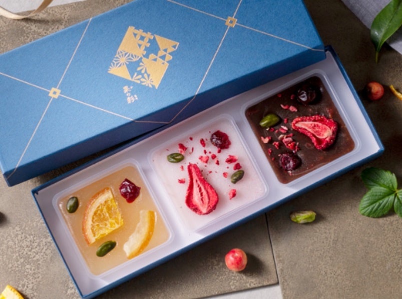 タブレットのように薄くした羊羹にドライフルーツやナツを合わせた3種をひと箱に。