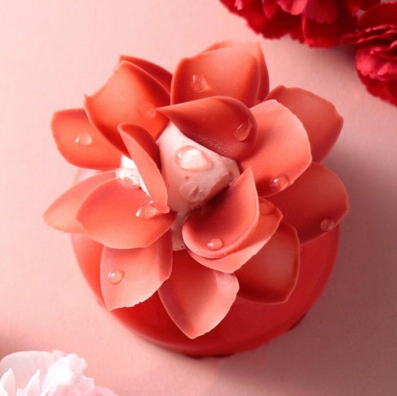 すべてチョコレートで形づくったカーネーションを苺と桃のさわやかなヨーグルトムースにのせて。