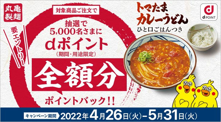 キャンペーン期間中にエントリー※1の上、丸亀製麺の店舗にてお支払いの際、「dポイントカード」「モバイルdポイントカード」「dカード® 」「dカード GOLD® 」「dカード プリペイド® 」のいずれかをご提示いただく、もしくは、「丸亀製麺」アプリのモバイルオーダーおよび「d払い® 」アプリ内「モバイルオーダーサービス」の「丸亀製麺テイクアウト」で「dアカウント® 」連携の上、対象商品をご注文いただくと、抽選で5,000名の方へ対象商品の金額分のdポイントを進呈します。