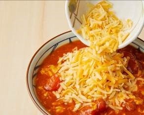約20種類のチーズの中から4種類のチーズを厳選しました。奥深いコクにゴーダ、芳醇な香りとコクはレッドチェダー、かすかな甘味としなやかな伸びをモッツァレラ、旨みと豊かな香りをパルメザン。とろりと溶けた4種のチーズは打ち立てうどんに絡み、トマたまカレーとの一体感を感じられるようにチーズの配合を0.1%までこだわりました。辛い物が苦手な方にも、チーズ好きな方にも大満足していただける一杯です。