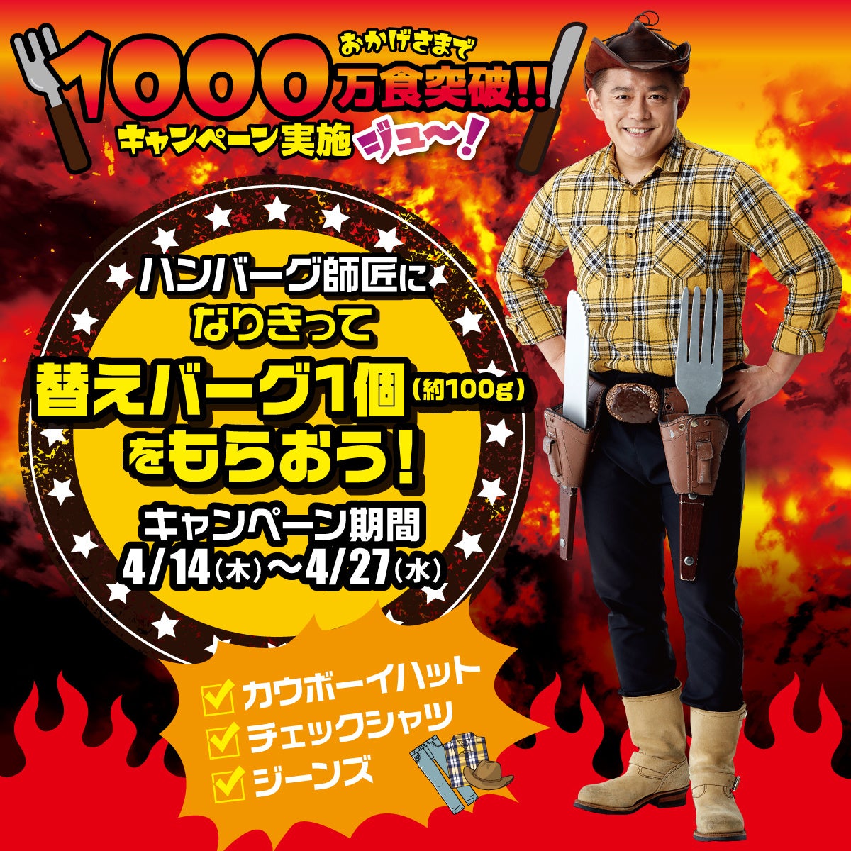 4月14日からは、応援隊長である「ハンバーグ師匠」になりきってご来店すると、替えバーグ1個(約100g)が無料になるお得なキャンペーンを開催中。