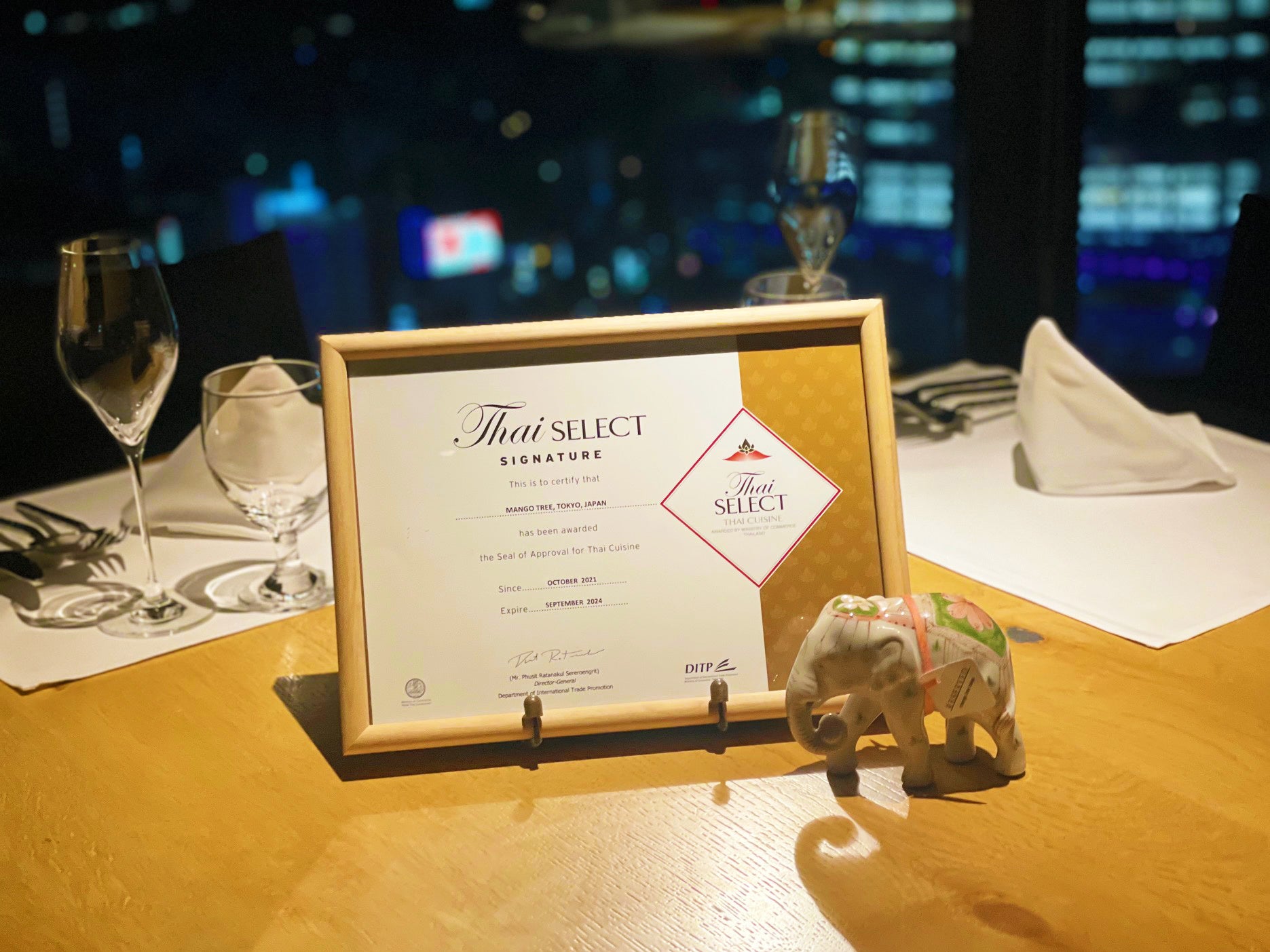 タイ国商務所の厳しい審査に合格したタイ・レストランに与えられる基準認定証、日本にいながら本場のタイ料理を味わえるレストランの証。その中でも、「タイ・セレクト・シグネチャー」とは、審査で5つ星にあたると評価されたレストランに与えられ