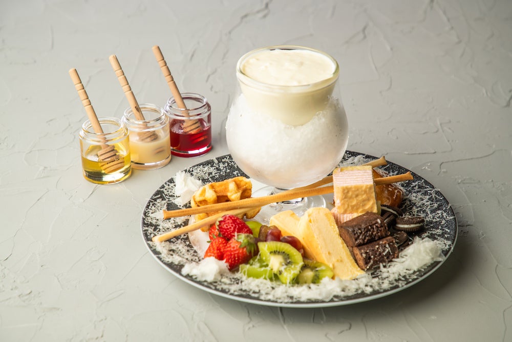 “冷たいチーズフォンデュ”は、クリームチーズとゴルゴンゾーラを使用したチーズの風味が濃厚な冷製チーズソースに、フレッシュフルーツやスイーツを贅沢にフォンデュすることで、冷たいチーズソース×スイーツの甘じょっぱい味わいが楽しめます。また、プレーン蜂蜜、ミルク蜂蜜、ベリー蜂蜜の3種類のはちみつがついており、それぞれのフレーバーで味わいの変化を楽しむこともできます。