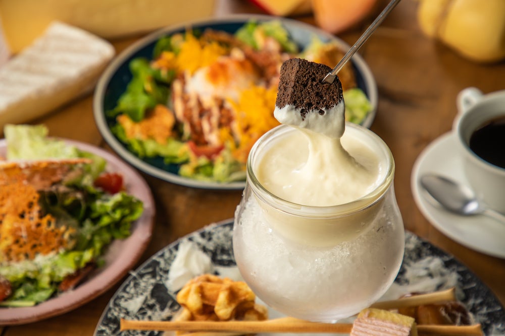「スイーツフロマージュフォンデュの贅沢コース仕立て」プランは、“冷たいチーズフォンデュ”に加え、選べるフードとサラダがついて、優雅なランチタイムをお楽しみいただけるプランとなっております。