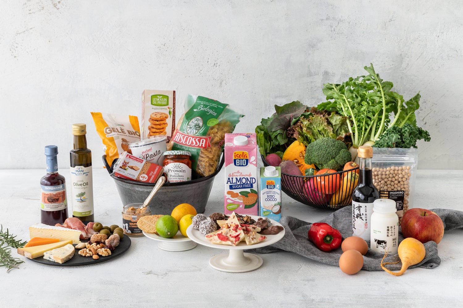 オーガニック植物性ミルク「イソラビオ」をはじめ、サステナブルなお茶「ジャストティー」や、残反(端切れ)で作られたエコフレンドリーなオリジナルポーチなどビオセボンでしか出会えないアイテムが14点入っています。