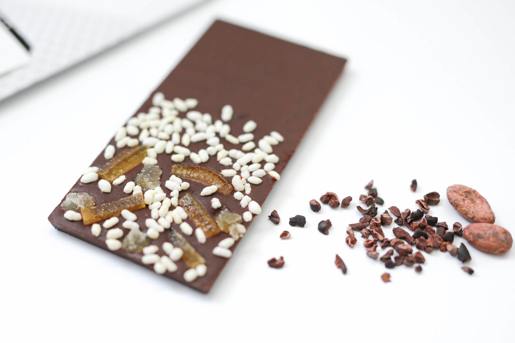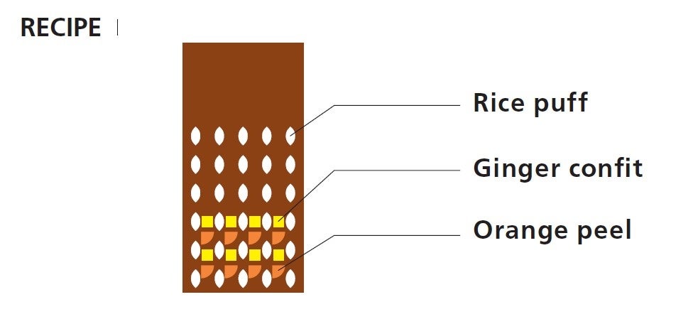 さらに最下部にはオレンジピール・ジンジャーコンフィをトッピングしています。チョコレートはベリーのような酸味を感じていただけますが、トッピングのオレンジピールと合わせることで、果実それぞれの味わいの違いを実感していただけます。またジンジャーコンフィと合わせることで、チョコレートのもつベリー系の味わいと相性の良いスパイス感を感じていただけます。