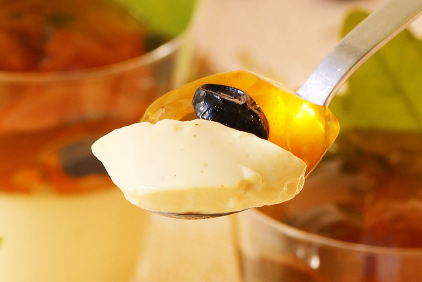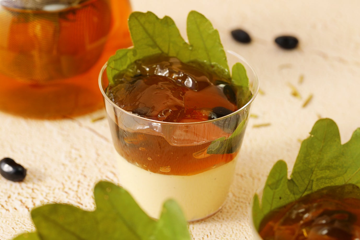 ゼリーの中に入れた黒豆の甘みをご賞味いただきながら、柔らかにとろけていく献上加賀棒茶のパンナコッタをご賞味いただけます。