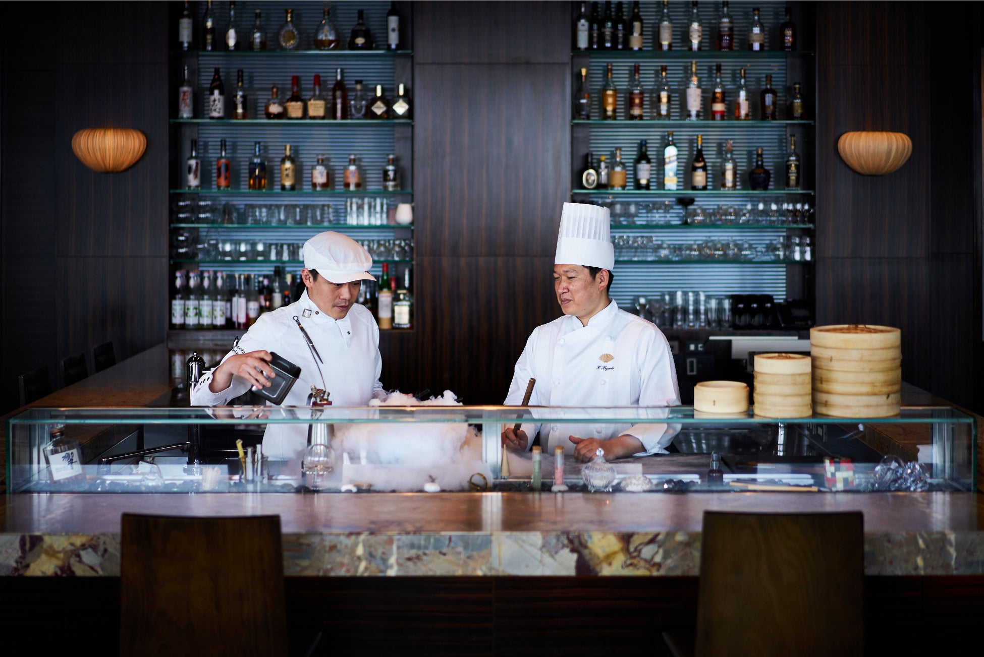 「タパス モラキュラーバー」(38階)を率いる料理長 牛窪は、慣れ親しんだ料理を分解し、別の食材とのコンビネーションやアプローチを加え、味・香り・食感・温度を再統合する「モラキュラー料理」に、クラシック、モダン、グローバルな技巧的、芸術的要素を加えた、クリエイティブな料理をご提供しております。一方、広東料理「センス」(37階)の点心長 林は、広東料理の伝統的な技法を駆使しながら日本の四季の食材をとりいれた点心をご用意しております。