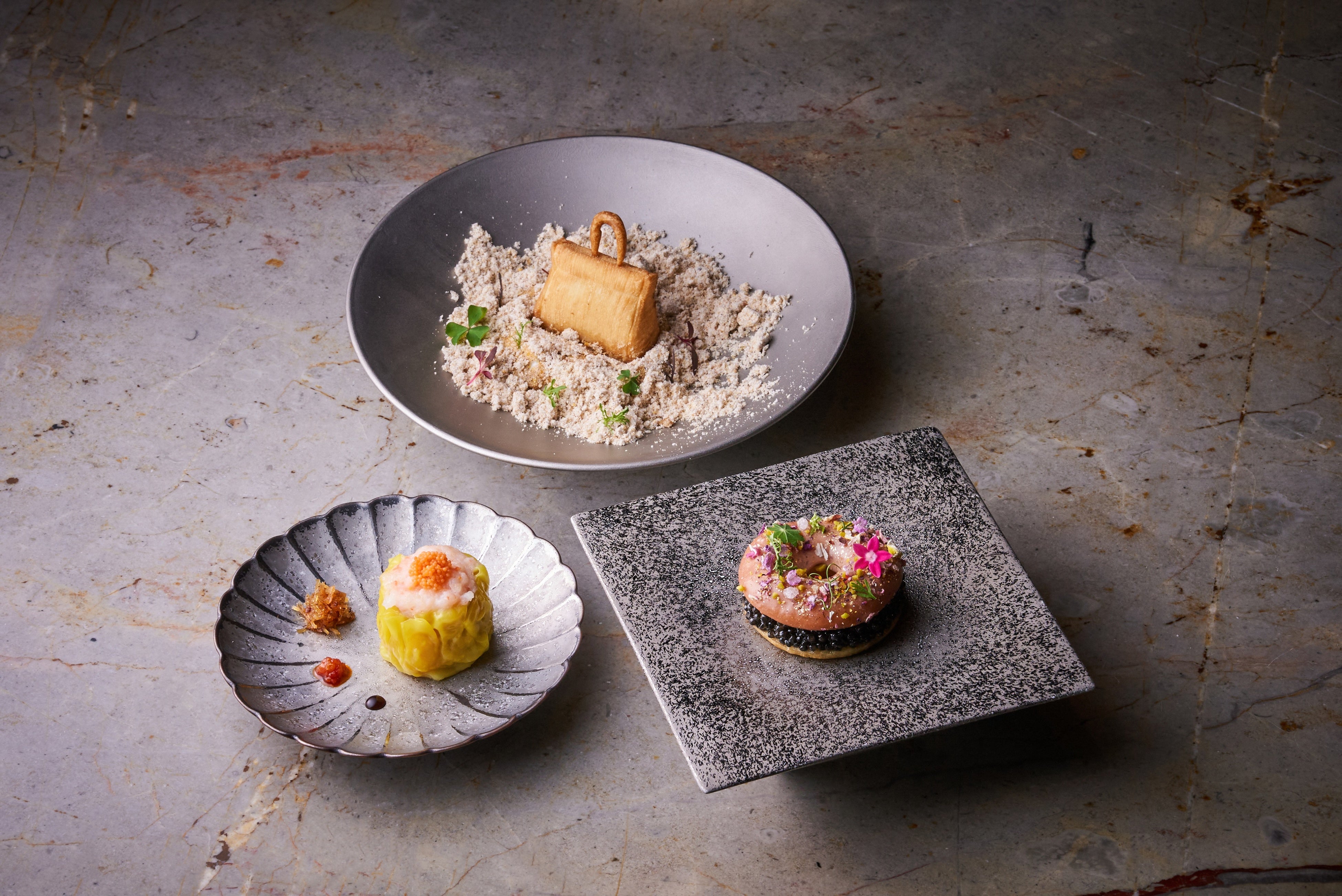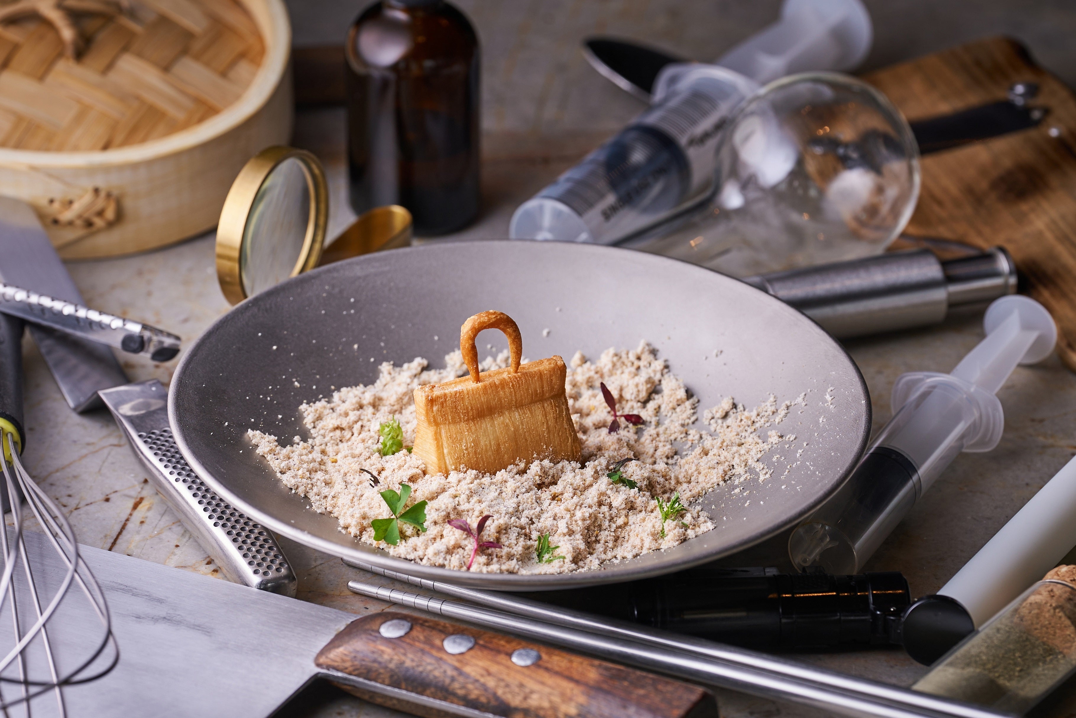 今回のコラボレーションメニューでは、ふたりの技術とユニークなアイデアをあわせ創作した「旅行中に忘れたスーツケース」、「芋角」、「鴨オールイン」を含む7品と、「タパス モラキュラーバー」の世界観を存分に満喫できる「ドーナッツ」、「遅れたクリスマスディナー」を含む6品、広東料理「センス」で人気の点心2品の、計15品で構成いたしました。「旅行中に忘れたスーツケース」は、旅の帰りに、砂浜の上に忘れてしまったスーツケースがテーマです。パリパリの生地の中にパイナップルのコンフィを詰めたサクサクの食感の飲茶に、ココナッツムースとほろ苦さでアクセントを加えたデザートに仕上げました。熟練の点心師の技と、「タパス モラキュラーバー」の「旅とアートの世界観」が合わさった一品です。