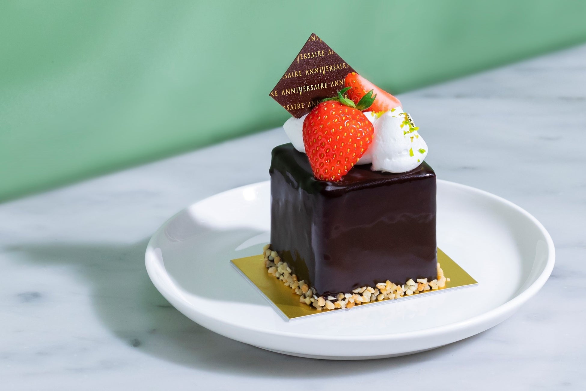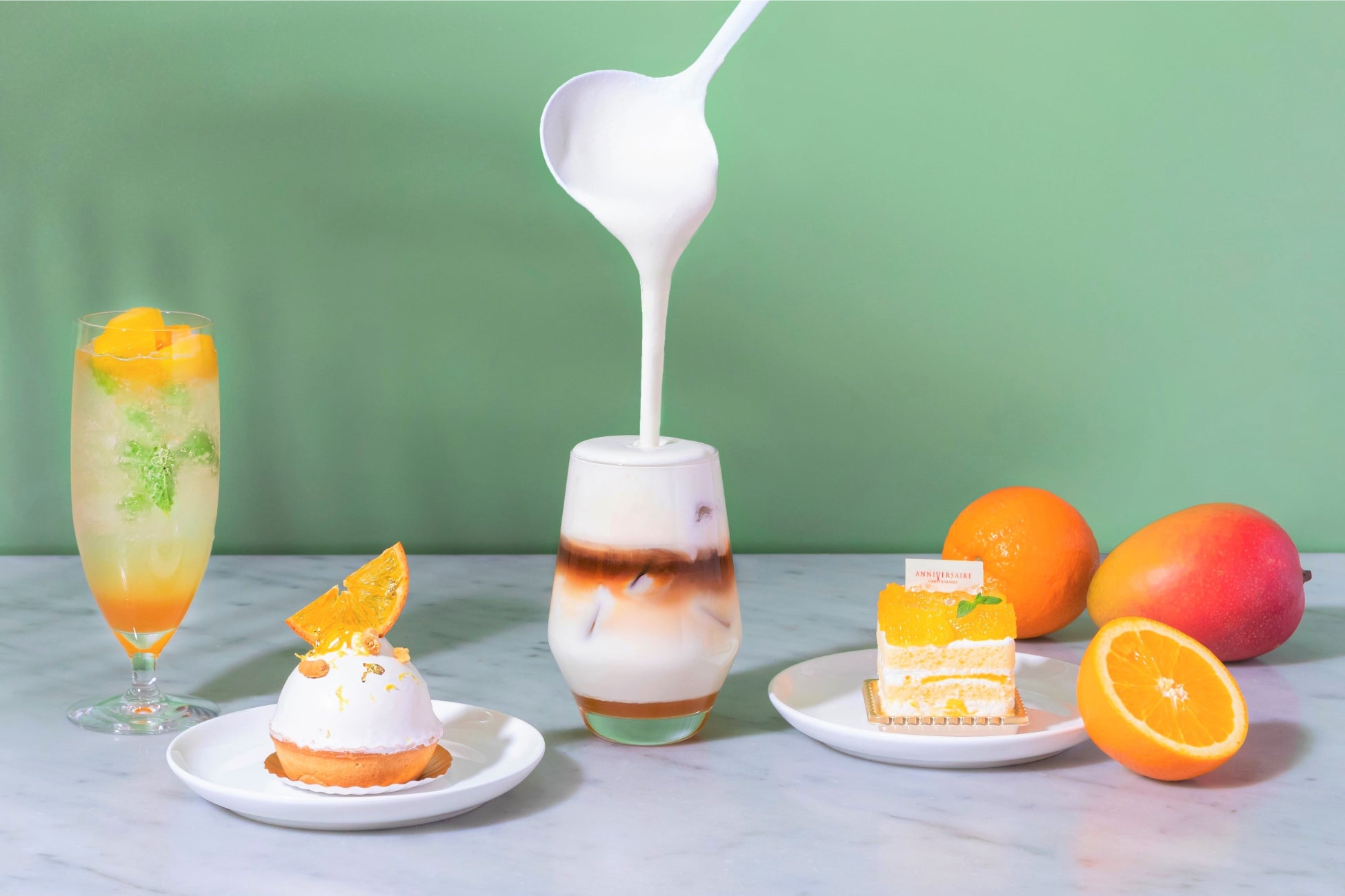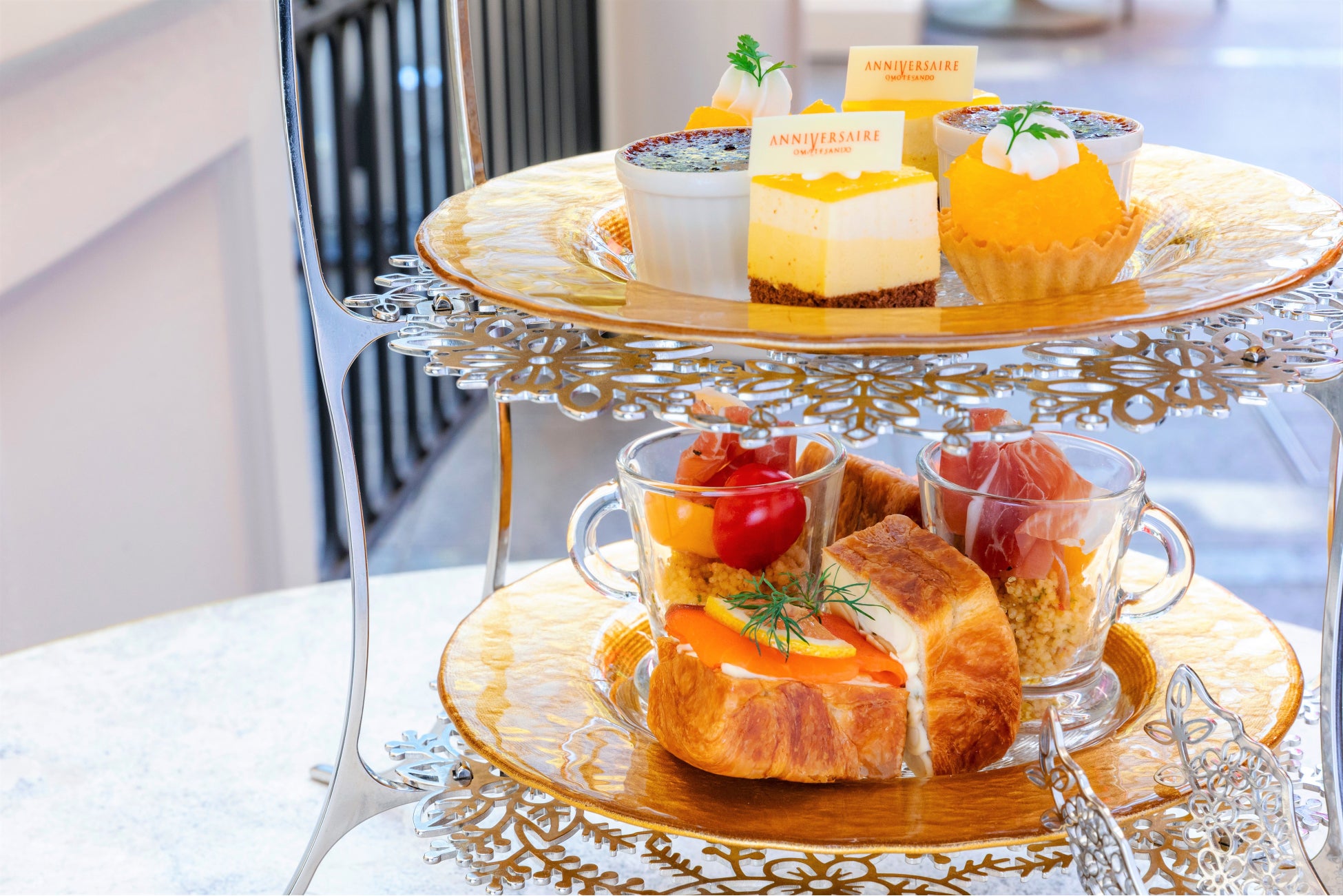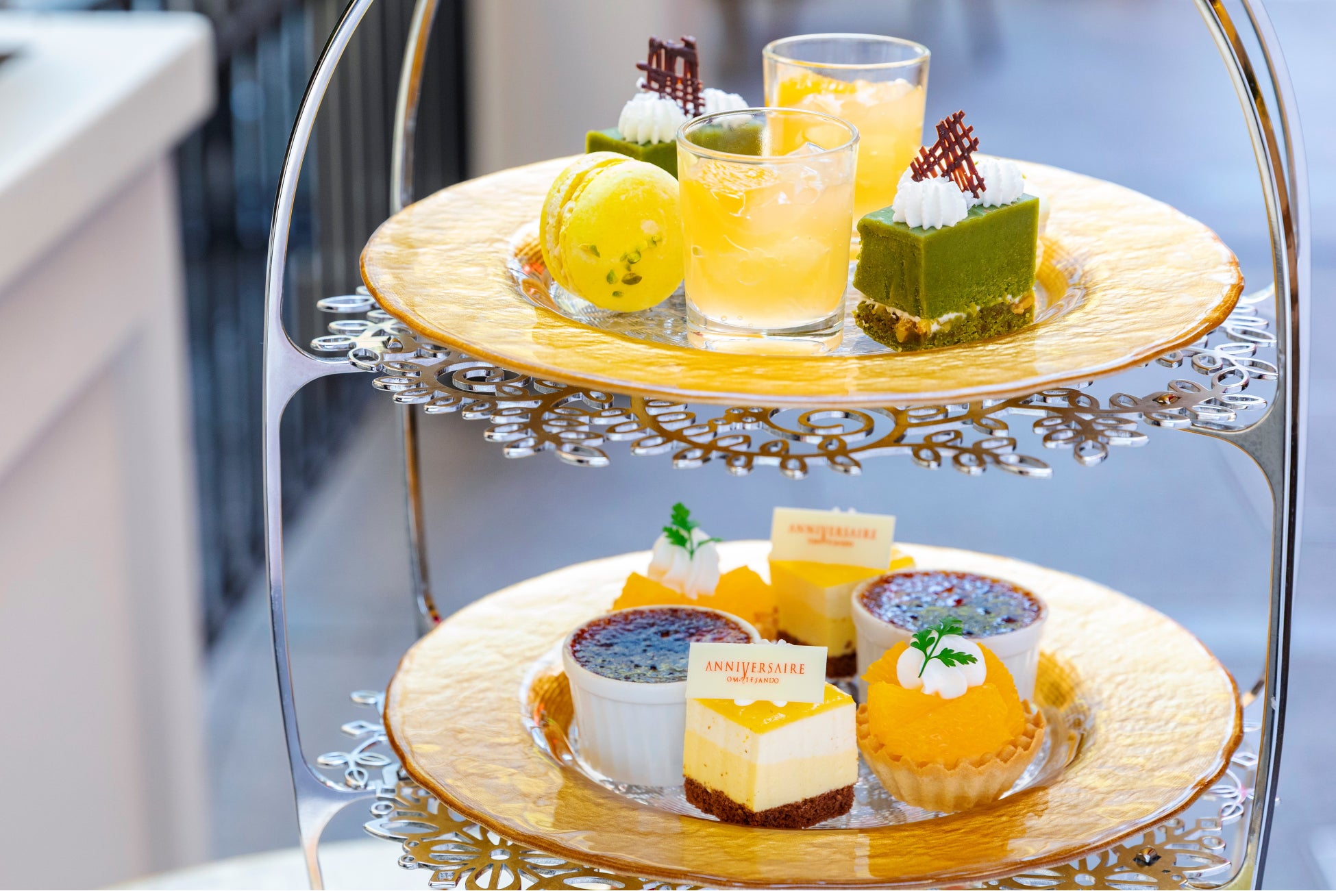 ANNIVERSAIREの「A」をモチーフとしたラグジュアリーなアフタヌーンティースタンドに、柑橘や抹茶を使用した初夏を感じるスイーツが贅沢に並びます。