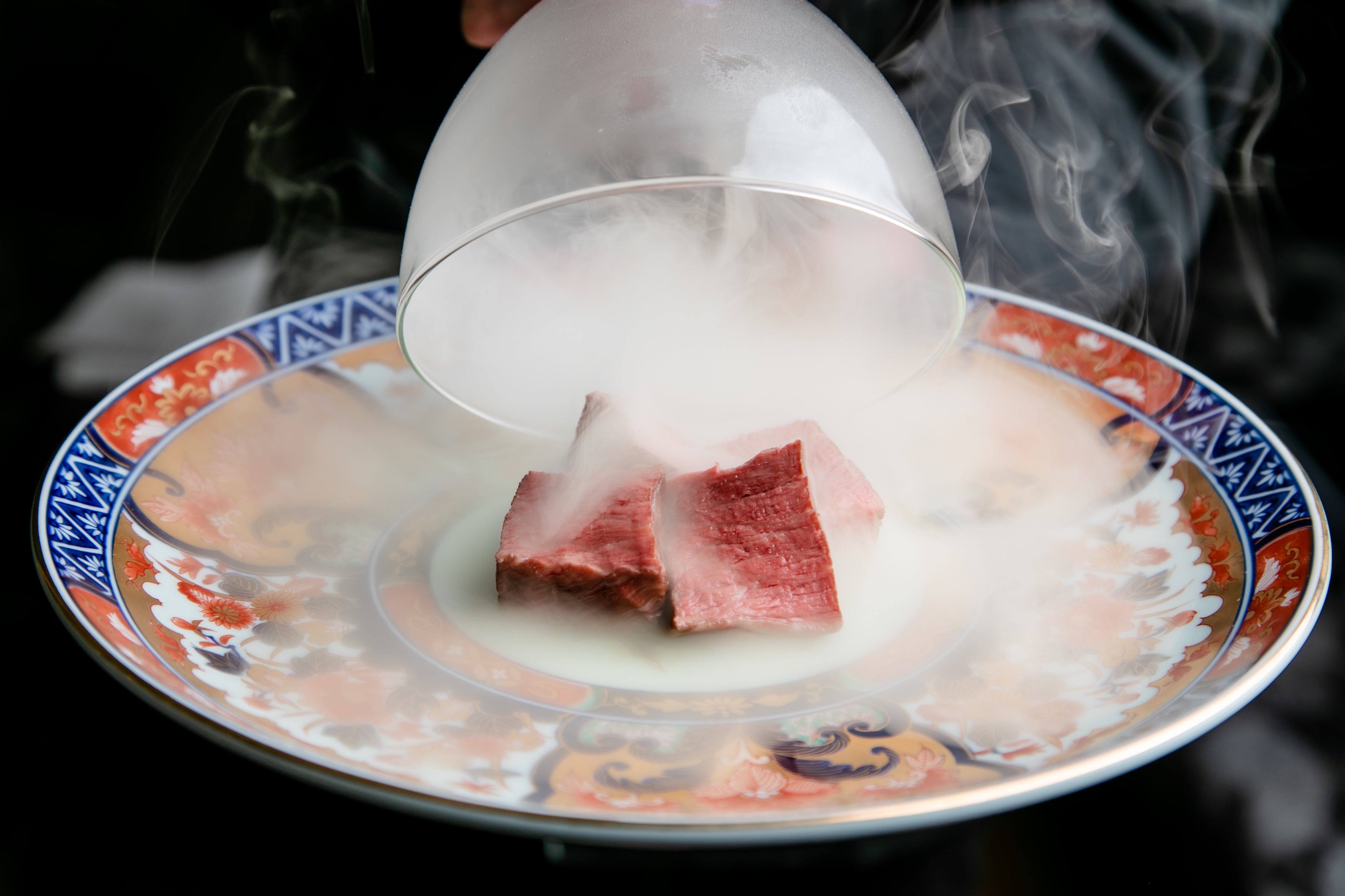 職人の技術を目の当たりにできるカウンター席で、競りから厳選した最高位A5黒毛和牛をお好きなだけお召し上がりいただけます。それぞれのお客様に合わせた気配りやおもてなしを忘れず、居心地の良いお食事のひとときを演出します。