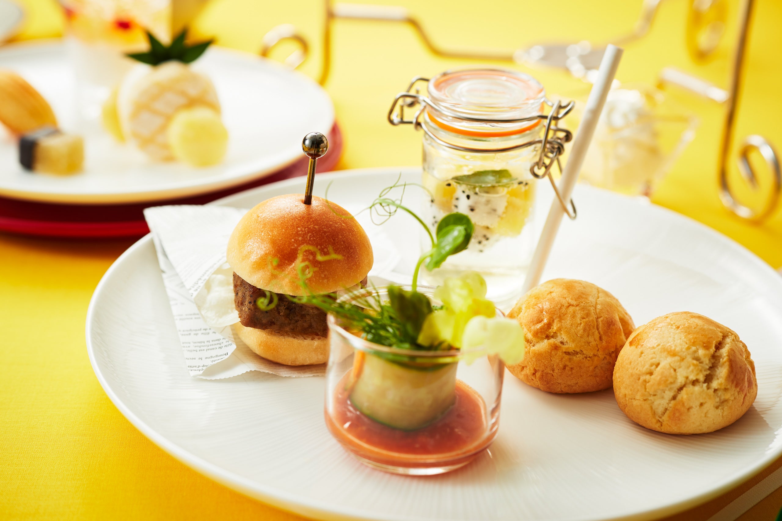 『パインアメアフタヌーンティーセット』は、パインアメ生クリームをサンドした見た目はまるでパイナップルな「パインアメショートケーキ」をはじめとし、シュークリーム、マドレーヌ、パート・ド・フリュイなどのスイーツと、パインアメのコンフィチュールをはさんだ「ポークパテミニバーガー」やサラダなどのセイヴォリーを取り揃えます。