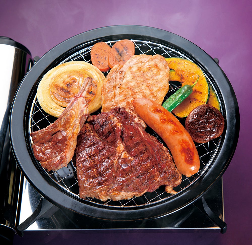 4種の肉(牛リブロース、豚ロース、ラムチョップ、ソーセージ)野菜各種のセット