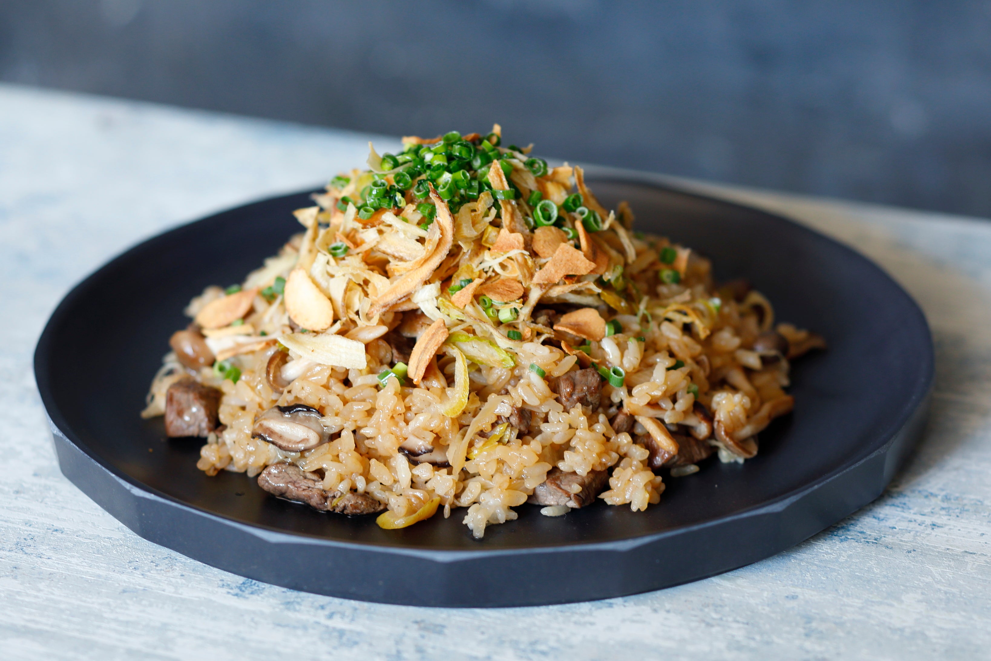 ガーリックと醤油の香りが食欲をそそる、レストラン「SATSUKI」の人気メニュー。柔らかく、噛むほどに旨みと風味が感じられるゴロゴロ牛肉と、キノコの歯ごたえがたまらない、ごちそうピラフです。