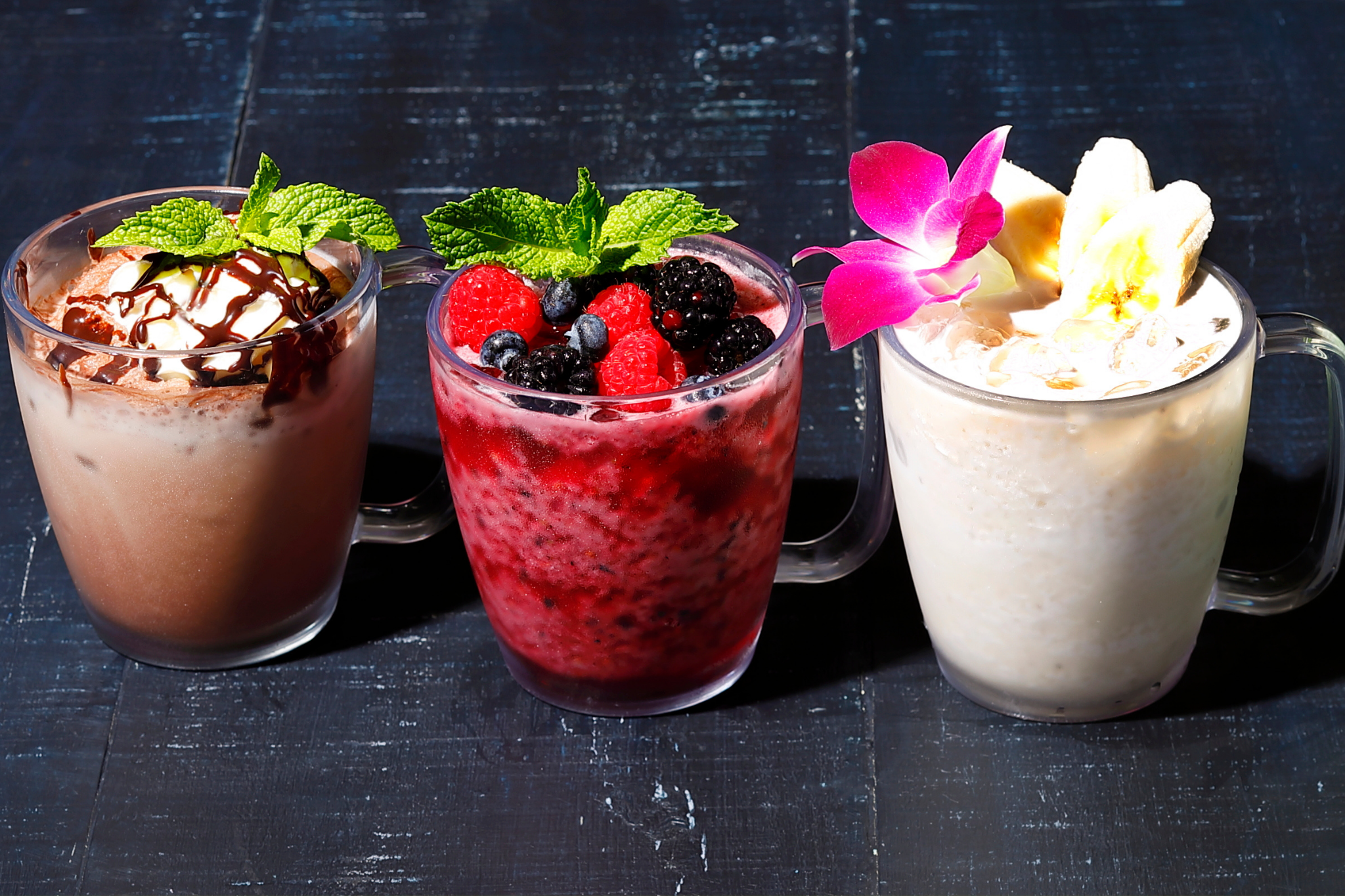 毎年大好評の「スムージーコレクション」からは、カフェモカ(写真左)・ミックスベリー(写真中央)・バナナ(写真右)の3種類をご用意いたしました。