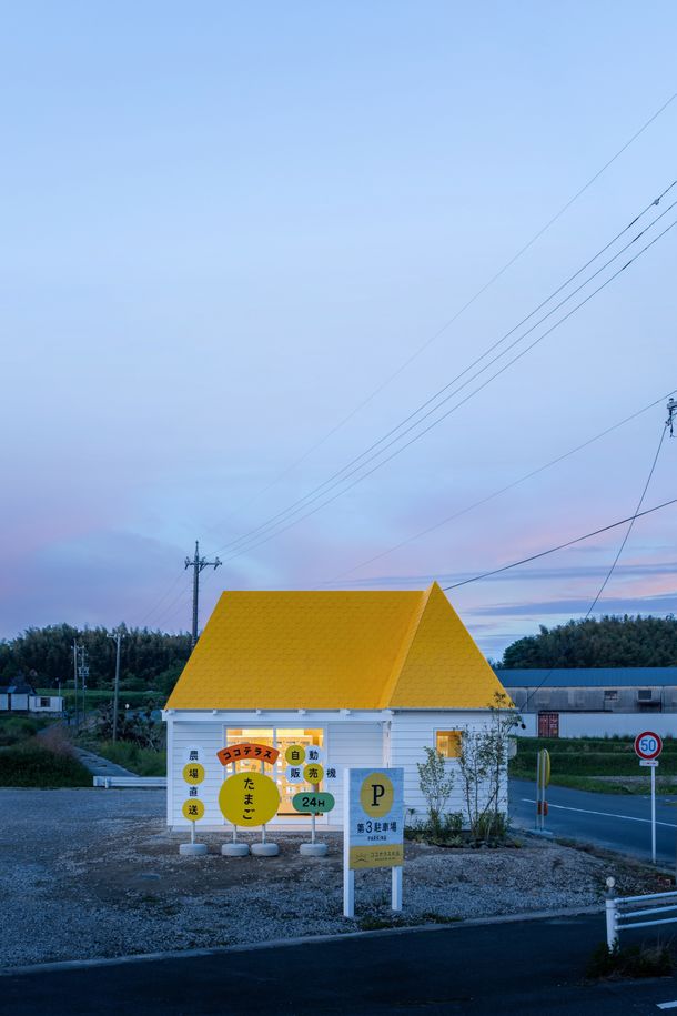 国道247号線沿いの黄色い屋根とポップな看板が目印。また従来の自販機には無い、無人だからこそ人の気配を感じられる空間づくりにも挑み、家のような安心感やぬくもりを感じることができます。深夜帯などを含め、どんな時間でも安心して足を踏み入れることができる設計です。