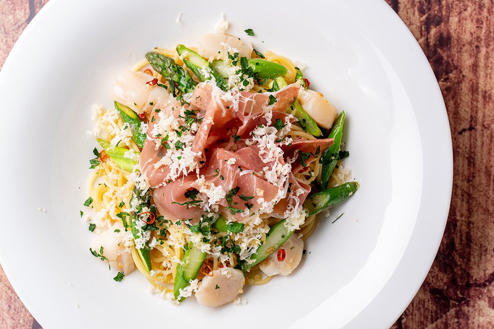 - メニュー名:北海道産アスパラとホタテ、生ハムの贅沢スパゲティ 山わさび風味