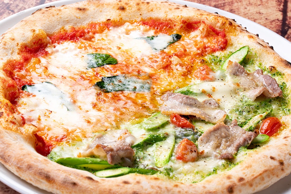 柔らかくミネラルたっぷりの美味しさが詰まったアスパラ「海の神」と北海道産豚肉の相性はバツグン!ミアボッカ人気№1のマルゲリータとハーフ&ハーフでもお楽しみ頂けます。