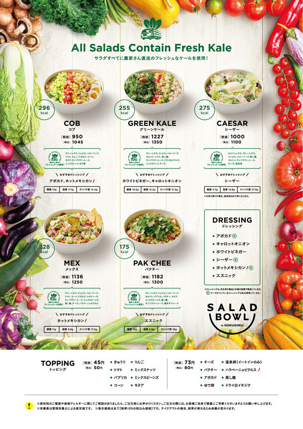 また、今回新業態となる「サラダボウル」もALL100%NATURALで提供いたします。農家さんから産地直送のサラダケールをふんだんに使用した、ボリューム満点、驚くほど美味しいサラダボウルメニュー。自家製ドレッシングが美味しい、心も身体も大満足な商品を用意しております。