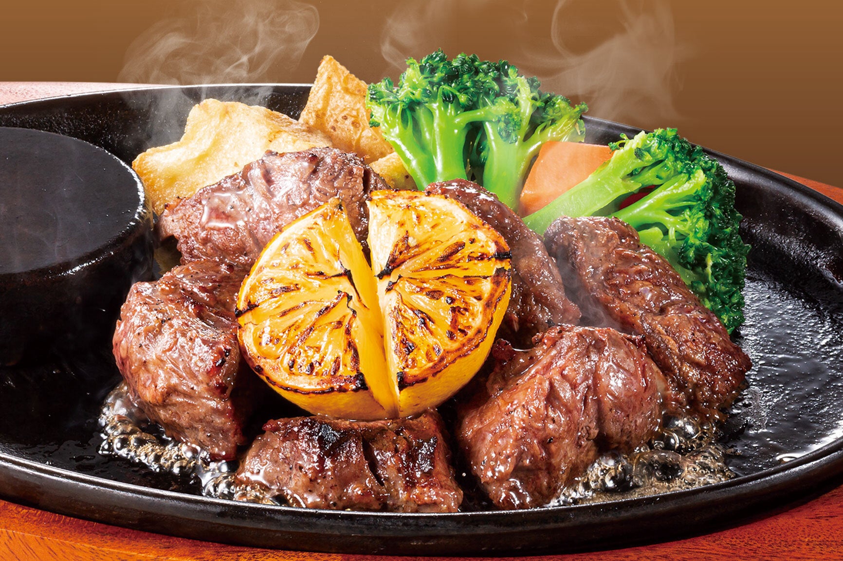 牛肩ロース肉を使ったカットステーキに藻塩や米麹を使った特製の塩だれで下味をつけ、ジューシーに焼き上げました。焼目をつけたレモンは、香り豊かで酸味はマイルド。脂身と赤身のバランスの良いステーキをさっぱりと爽やかに召し上がっていただけます。おかわり自由のライス・パン、スープバー付で価格は 1,480円(税込1,628円)。