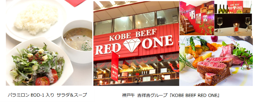 株式会社ミカレア(神鋼環境ソリューショングループ、本社:神戸市中央区、代表取締役社長:大谷和由)と神戸牛 吉祥吉グループ(本社:神戸市中央区、代表取締役社長:赤木 清美)のコラボにより、神戸牛ステーキをリーズナブルな価格で提供する『KOBE BEEF RED ONE』にて元気スイッチ成分、パラミロンEOD-1入りのメニューの販売が始まりました。