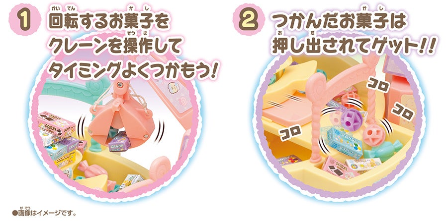 ゲーム中、本物のクレーンゲームのように軽快なBGMが流れ、本体中心部の『しろくま』がレーン上のお菓子アイテムの流れる速度を上げたり下げたりして、ゲームを盛り上げます。『しろくま』はお菓子アイテムをたくさん乗せたトレイを抱えていて、プレイヤーが所定の位置にお菓子アイテムを落とすと、落としたプレイヤーのスライドテーブルにお菓子アイテムを一気に流してくれる「ジャックポッドアクション」が発動します。また、お菓子を模した「お菓子アイテム」(付属)のほか、市販の本物のお菓子でも遊ぶことができます。