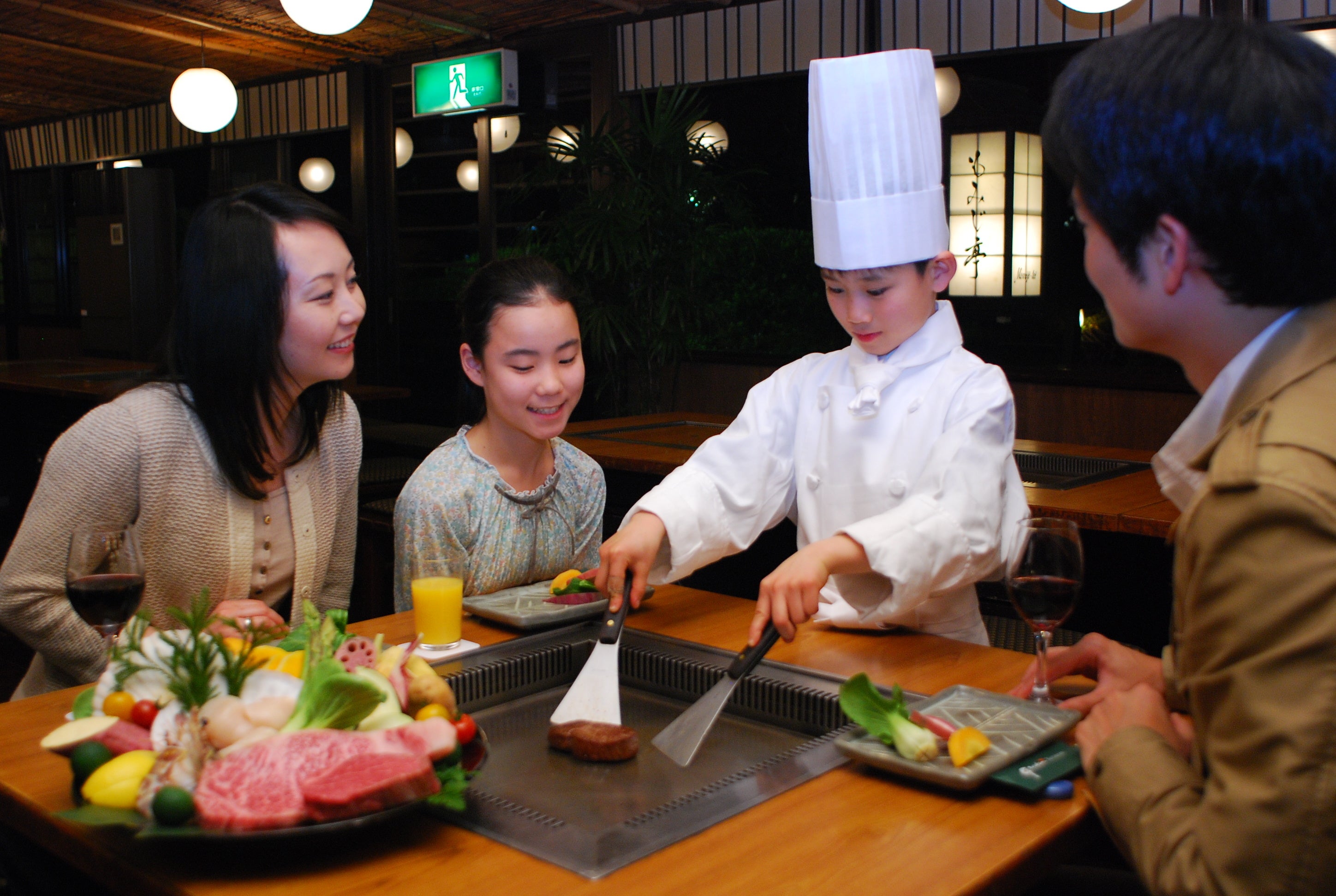新緑の日本庭園内に佇むガーデンレストラン「もみじ亭」でコックコートに身を包み、ホテルシェフにサポートを受けながら鉄板焼コースの一部を”1日シェフ”として挑戦していただきます。厳選されたお肉やお魚、焼き野菜からデザートまで、ご家族でゆっくりと食を楽しむ体験型ランチ・ディナーは、ゴールデンウィークの想い出づくりにぴったりです。