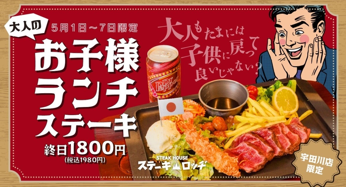 5月5日(木)はこどもの日。『ステーキロッヂ 渋谷宇田川店』では、普段仕事に家事にと忙しい毎日を送っている大人たちのために、この時ばかりは子供に戻ってのびのびと食事を楽しんでいただこうと、スペシャルメニュー『大人のお子様ランチステーキ』をご用意しました。
