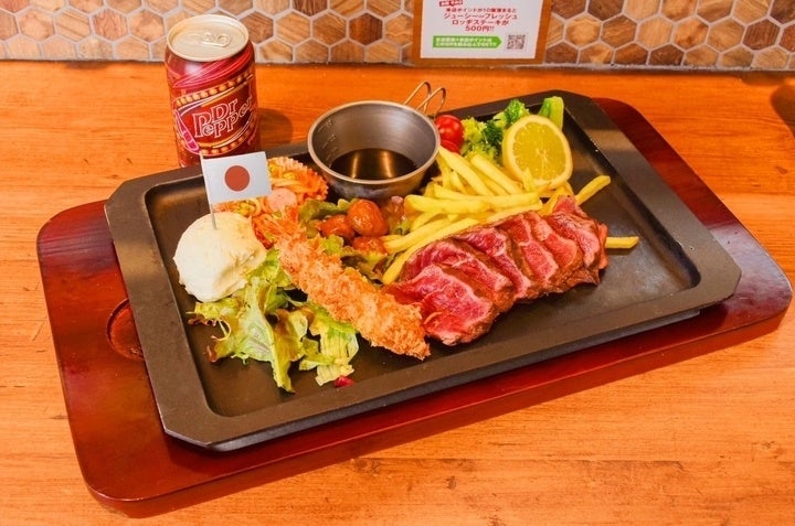 『大人のお子様ランチステーキ』はこどもの日を含む5月1日(日)〜5月7日(土)のGW期間、渋谷宇田川店限定でご提供します。ランチのみならず、夜まで終日ご注文可能です。また、このメニューをご注文のお客様に限り、子供の頃の思い出が蘇るドリンク「ドクターペッパー」1本がサービスとなります。