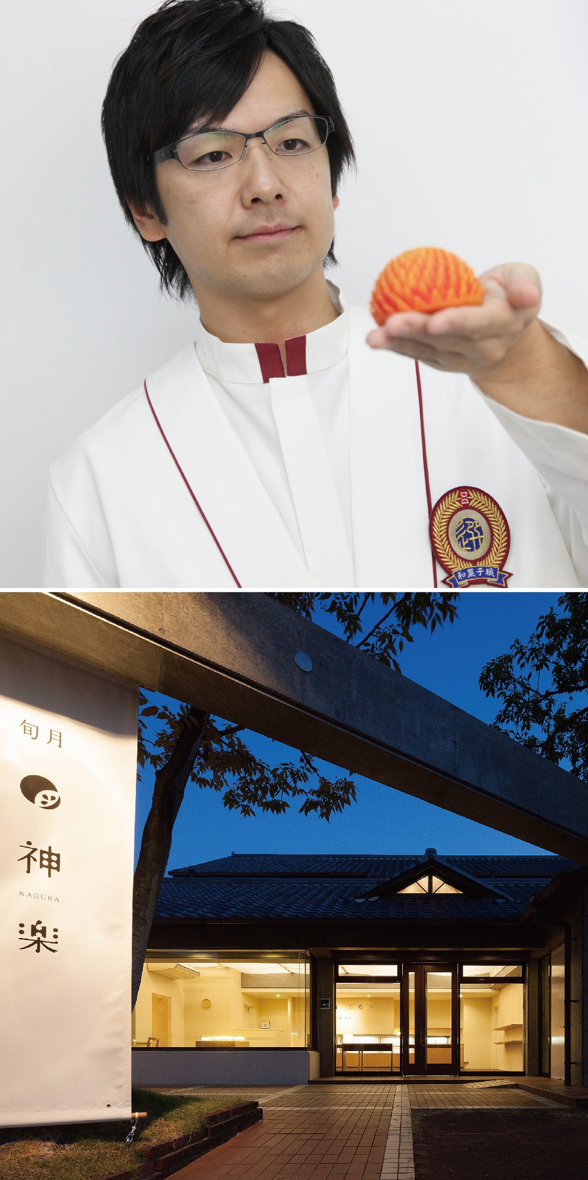 『旬月神楽』の店主 明神宜之氏は、広島県呉市の銘菓「蜜饅頭」で知られる「蜜屋」に生まれ、日本菓子協会東和会の「最優秀技術会長賞」、全国菓子大博覧会「農林水産大臣賞」など数々の輝かしい受賞歴を持ち、和菓子界の未来を担う職人として注目を集めています。独創的で繊細な作品は高く評価され、ヨーロッパやアジアでの実演や講演会を行うほか、コロナ禍においては全国の和菓子店と「旅する和菓子」を企画するなど多方面で活躍され、メディアでも度々取り上げられています。