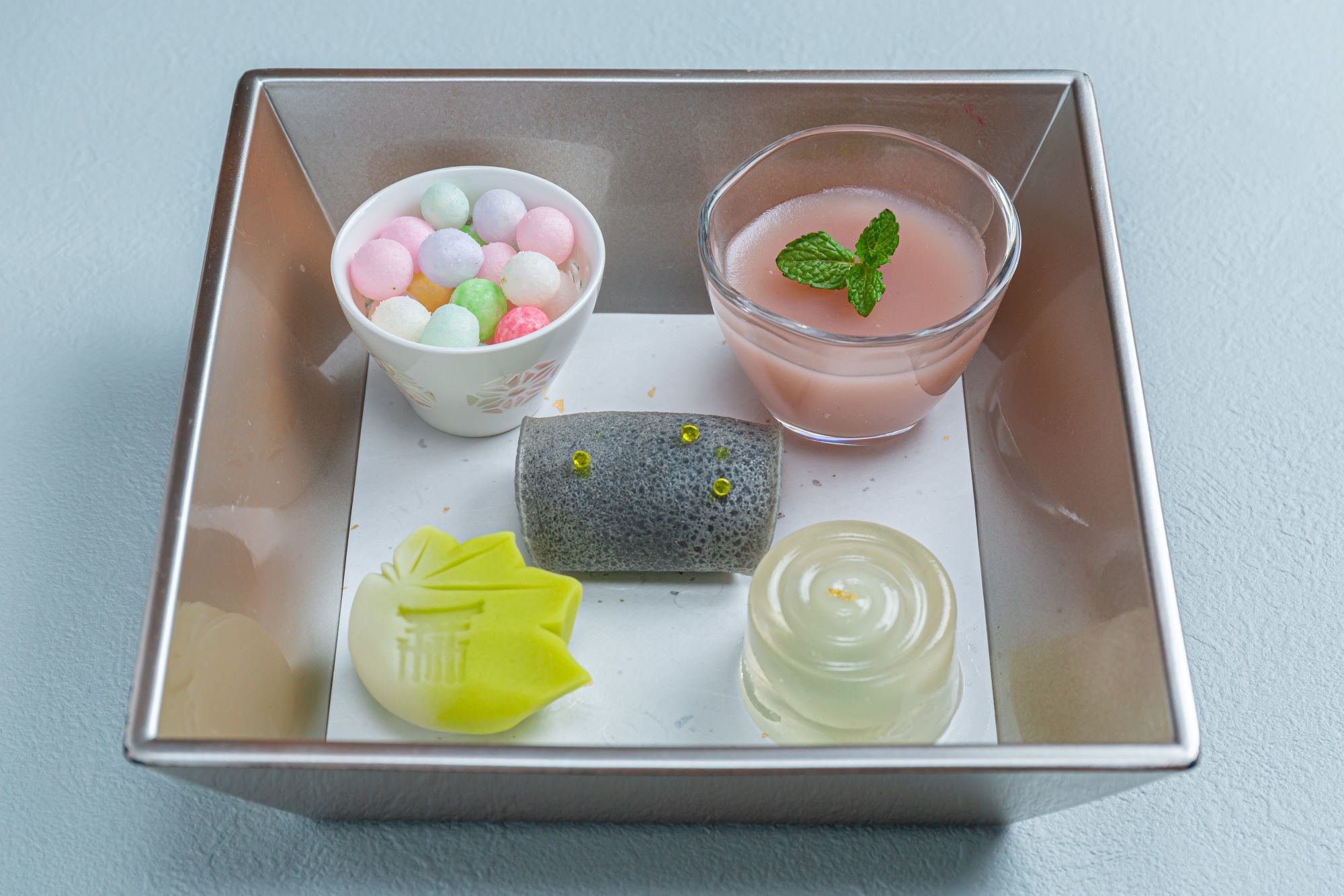 今回は『旬月神楽』のスペシャリテ上生菓子『月白(げっぱく)』をはじめ、今回のコラボレーションアフタヌーンティーでしか食べることのできない創作菓子や、上質の国産本わらび粉と上白糖を練り上げて、とろけるような食感に仕上げた『水蕨餅』など洗練された和菓子7種をラインナップ。