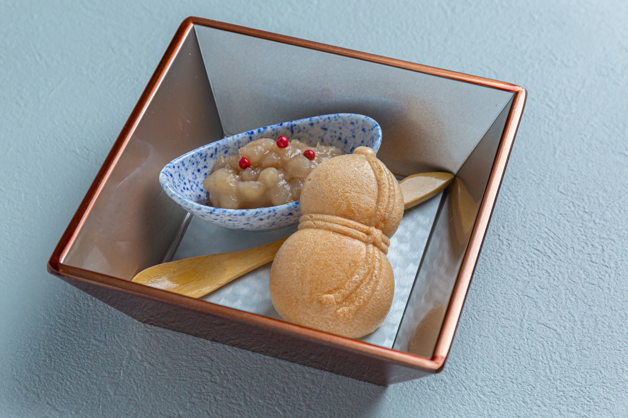 ・手作り最中:生産量が少なく貴重な白小豆を丁寧に炊いてゆるめに仕上げた甘さ控えめの白餡にピンクペッパーのピリっとしたアクセントを加えました。召し上がる直前に最中にのせてパリッとした皮ととろりとした餡のコントラストをお楽しみください
