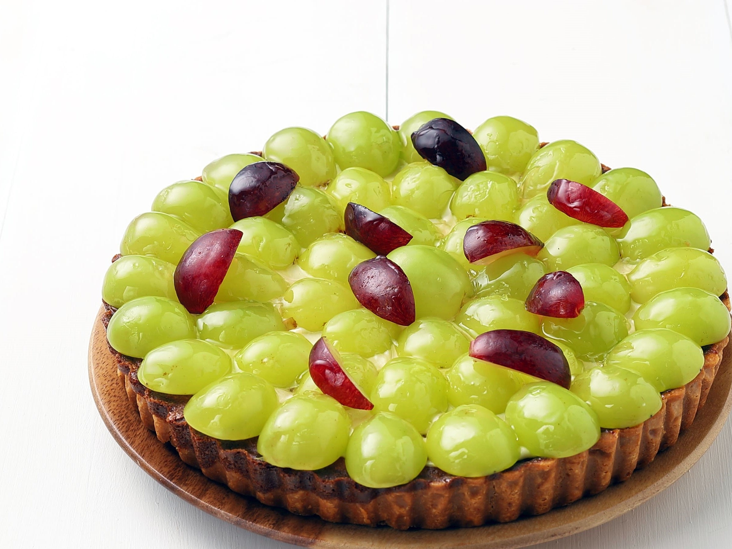 爽やかな香りと上品な甘みのシャインマスカットと兵庫県産のぶどうで彩られたタルト。皮ごと食べられるシャインマスカットと甘味豊かなぶどうの二つの味を愉しめます。