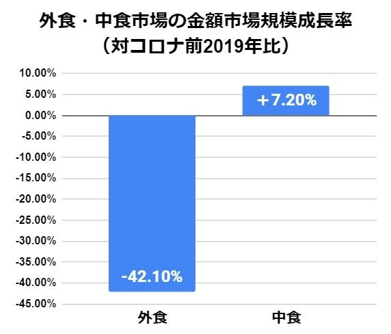 実際にエヌピーディー・ジャパン株式会社の調査データによると、外食・中食市場の金額市場規模成長率(コロナ前2019年比)は外食市場ではー42.1%と大幅に減少しており、逆に中食市場では+7.2%市場が増加しています。