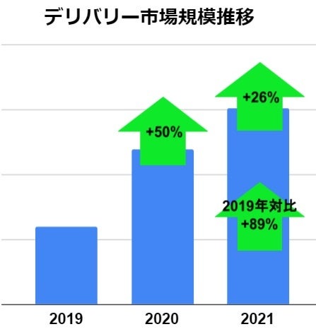さらに2021年の外食業態のデリバリー市場規模推移では、前年比26%増、コロナ前2019年同期比で89%増となっています。レストランの売上に占めるデリバリー比率においても、コロナ前の約3倍の比率です。
