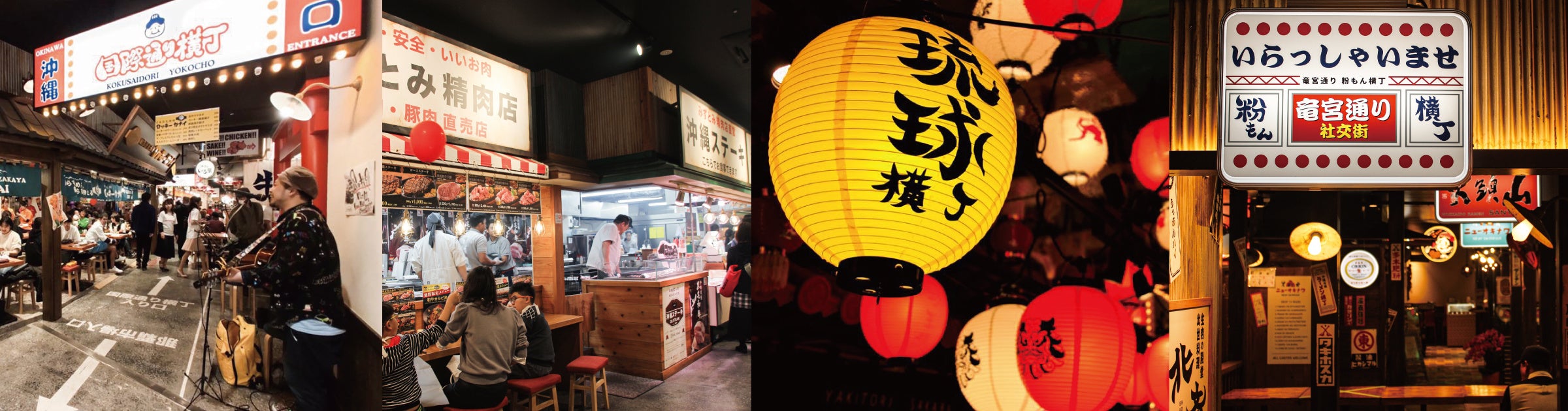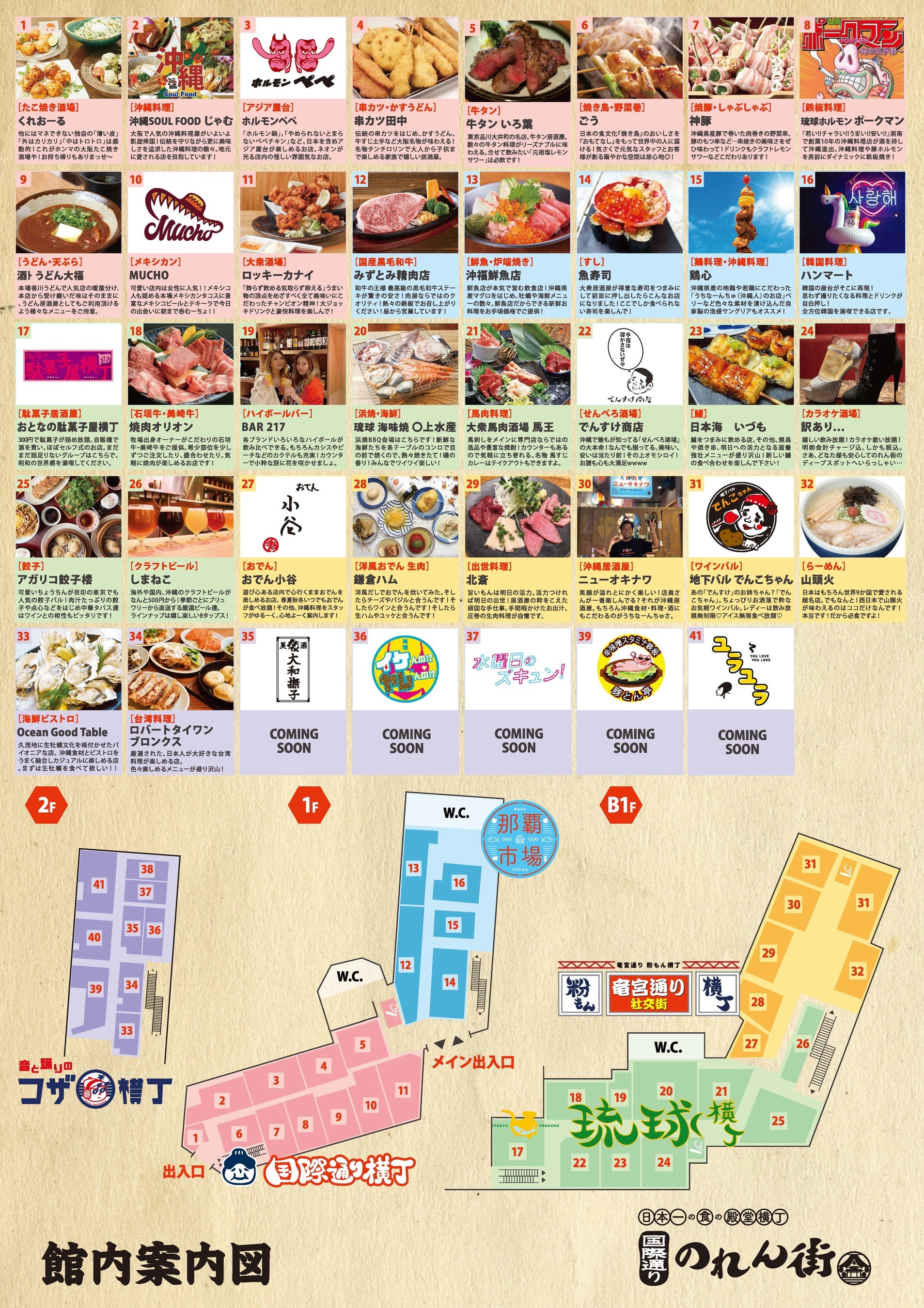国際通り横丁、那覇市場、琉球横丁、竜宮通り粉もん横丁の4エリアにさらにコザ横丁(2階)が加わり