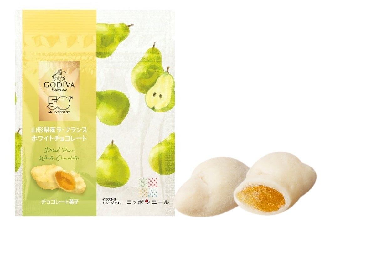上品な味わいの山形県産ラ・フランスを蜜漬けにして乾燥させ、ベルギー産のホワイトチョコレートでコーティング。