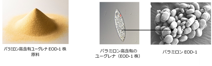 「パラミロン」は、微細藻類であるユーグレナのみが細胞内貯蔵物質として生成する高密度の不溶性食物繊維です。「パラミロンEOD-1」とは、ユーグレナの中で(株)神鋼環境ソリューションが特許を取得している新規株「ユーグレナEOD-1株」に含まれるパラミロンのこと。近年の研究により、精神的・身体的疲労感の軽減効果が認められています。