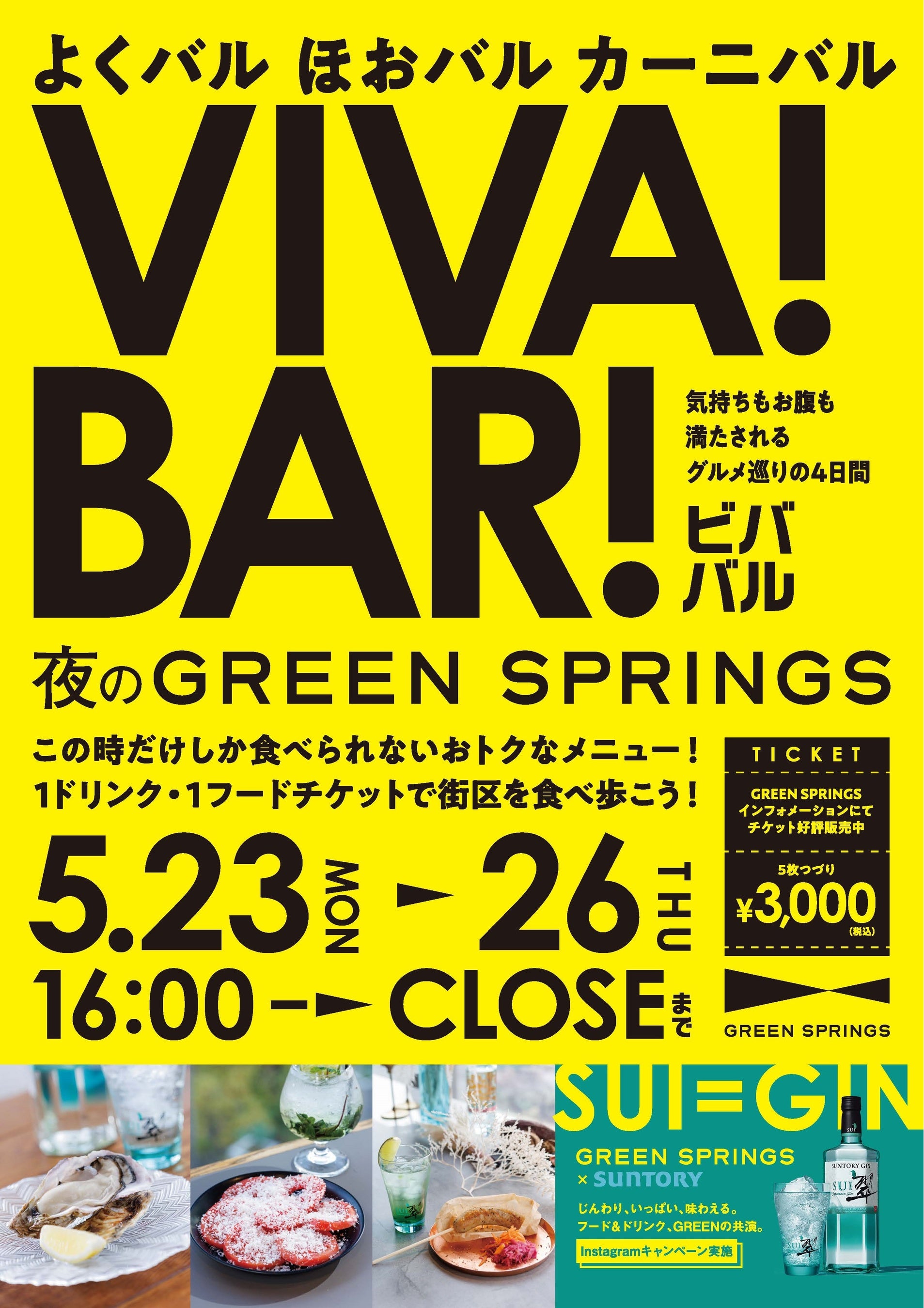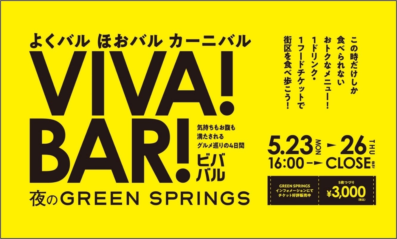 当社(本社:東京都立川市/代表取締役:村山正道)が運営する複合施設GREEN SPRINGSにて、 5月23日(月)~26日(木)、バル企画参加店舗を巡り、チケット制で食べ/飲み歩きを楽しむバルイベント「VIVA!BAR!(ビバ!バル!)」を開催いたします。