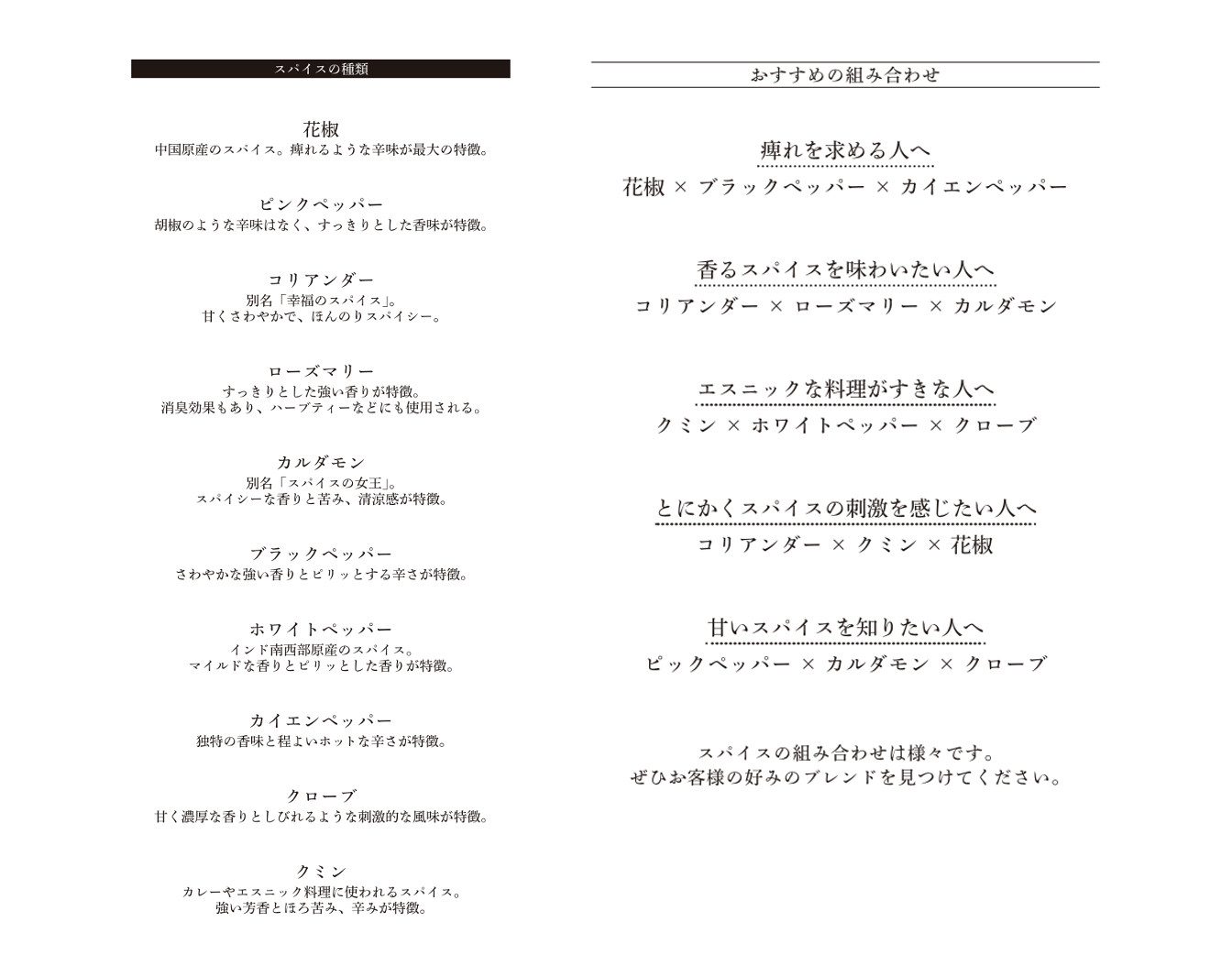 スパイスはストレスの緩和、疲労抑制や生活習慣病、冷え性、花粉症など様々な人の課題に対して、身体の内側から体調を整える作用があるとされています。また独特の刺激や香りは普段食べている料理とは違った非日常を提供してくれます。スパイスの歴史は古く、大航海時代に多くの航海者たちがヨーロッパを飛び出し、新たな航路や大陸の発見に力を尽くしました。その目的のひとつがスパイスだといわれていることから、まさにスパイスは旅や冒険を象徴するものです。