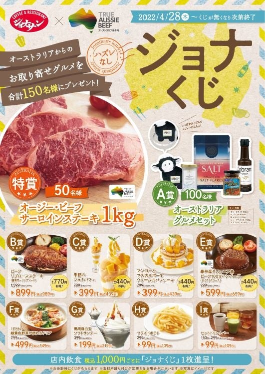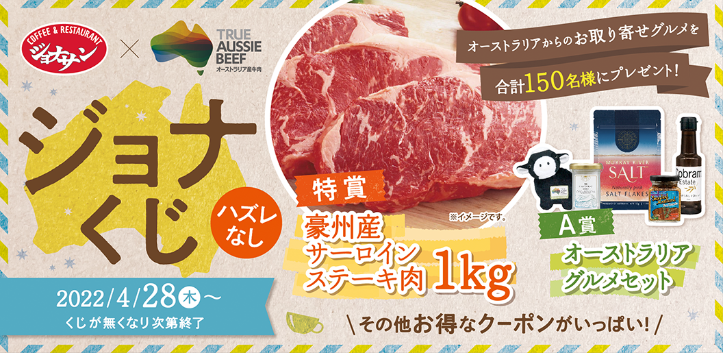 | 【ハズレなしの「ジョナくじ」 おすすめポイント】 ① 店内ご飲食で「豪州産サーロインステーキ肉1kg」等豪華景品が当たる! お会計1,000円(税込)毎に、「ジョナくじ」1枚をお渡し(※1)。今回はMLA(※2)の協賛でオーストラリアからのお取り寄せグルメを含む景品をご用意しております。 ② 最大税込770円引き!人気メニューが対象のお得なクーポンも目白押し ③ 厳しい管理体制の元で生産された安全・安心なオージー・ビーフをジョナサンで |